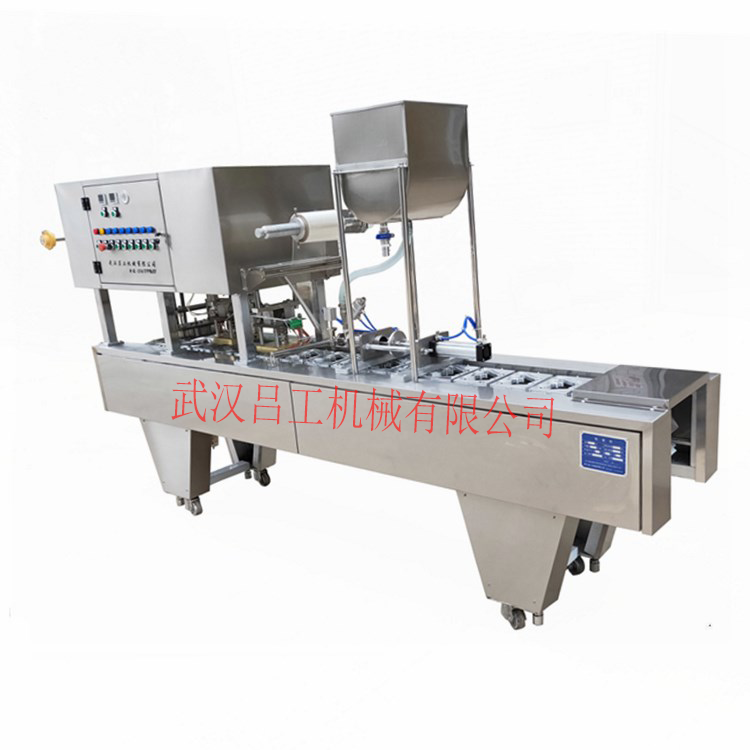 塑料盒灌装封口机 一出四 盒装米豆腐 豌豆凉粉 自动落盒灌装 输出成品