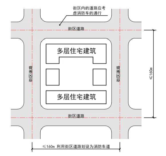 1.1针对多层住宅建筑的居民小区,以居民小区周边的街区道路作为消防车道,满足消防车道通行要求,即小区周边的街区道路中心线的距离 小于160米时,即可使用街区道路作为消防车道。【图示1.1】