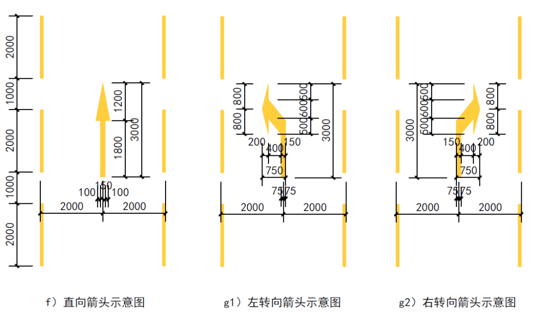 4.7 转向导向箭头应根据实际的车道导向需要设置,箭头应距曲线段起点3m处设置,转向导向箭头组合使用时不宜超过2种方向。做法参见【详图)f)g1)g2)】