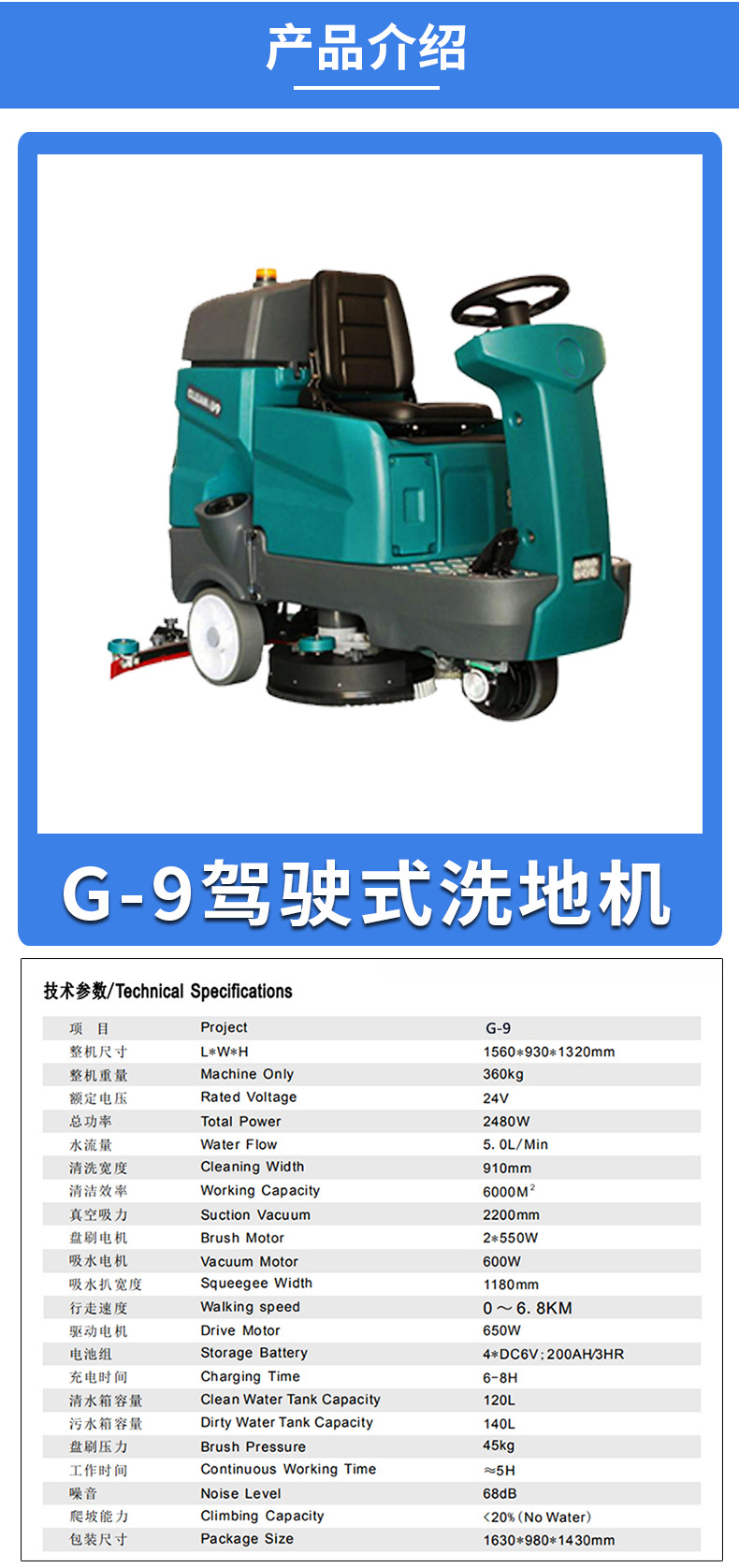 4、洗地车允许的爬坡角为10度,为保护驱动电机,电路会自动关闭并蜂鸣报警,关闭电源后可重新启动。