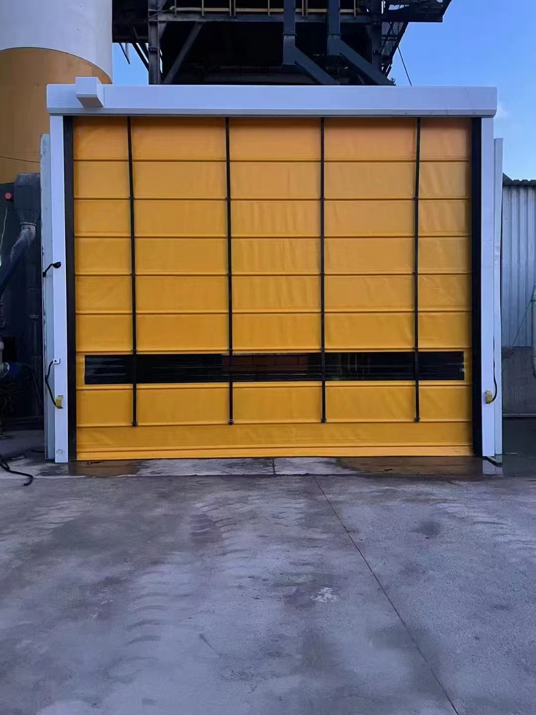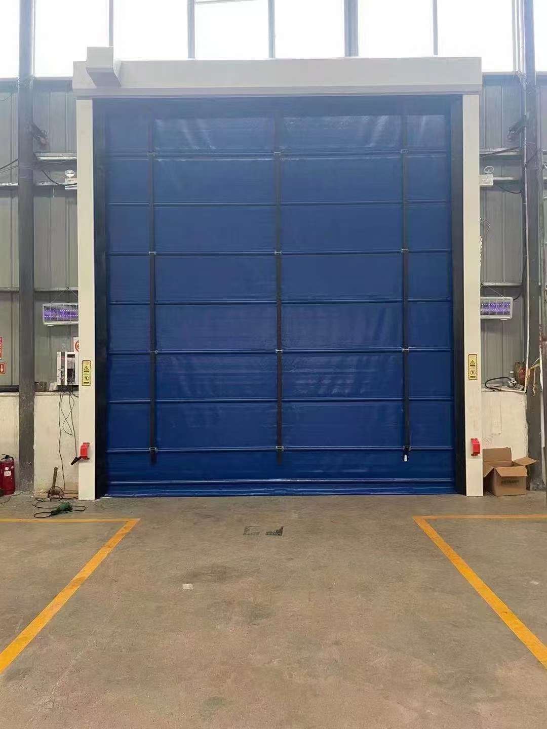 2、帘布为0.8mm厚法国高强度PVC涂层基布,1.0-1.5mm厚高透明PVC软片视窗,门体由多道高强度抗风圆管组成,德沃Z新研发出双层内轨道技术提高了门体的抗风性能(93Km/h,相当于十级风力)。