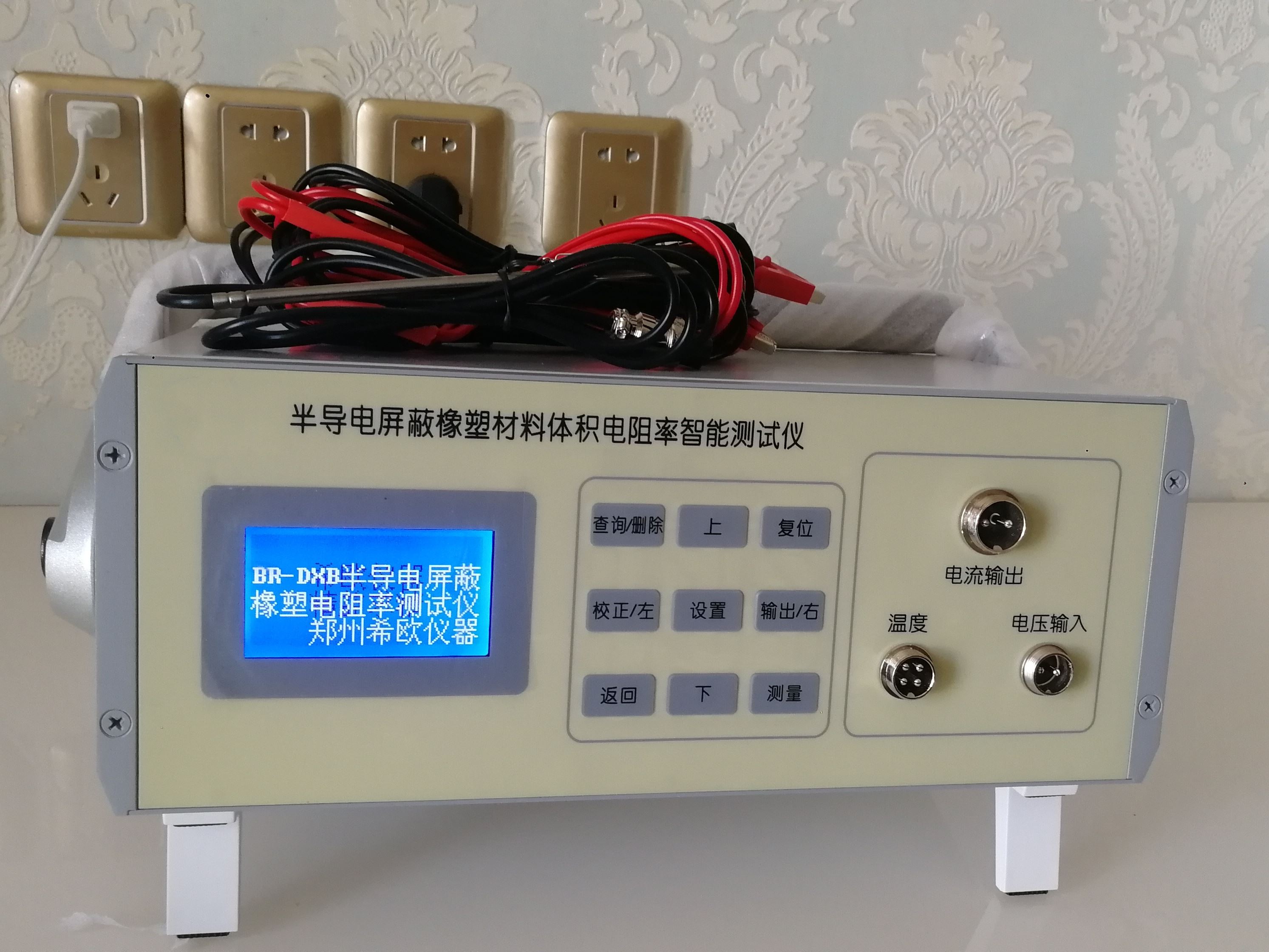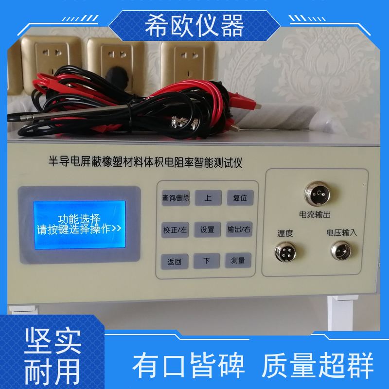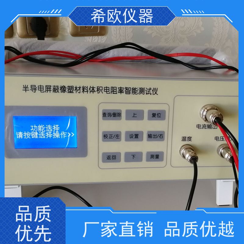 郑州希欧仪器设备有限公司半导电屏蔽橡塑材料电阻率智能测试仪产品特点: 1、测试仪可以实现宽范围0.01uΩ-5MΩ最高精度达±0.05%的电阻测量。电阻测量采用四端子测量法,自动消除接触电阻误差。 2、十四级电阻测量档位十一级测量电流自动转换,自动选择合适的档位,测量结果自动保存。 3、1mΩ-3MΩ十一级标准电阻自校准,保证测量的准确性,消除传统电阻测试设备使用一段时间后因电子器件老化产生偏差而又无法修正的忧虑。 4、用于半导电屏蔽电阻率测量时,可以实现106-10-8Ω.m的超宽测量范围;用于橡塑材料体积电阻率测量时,可以实现106-10-8Ω.cm的超宽测量范围。 5、测量半导电屏蔽电阻率时自动确定电流,自动确定档位,自动计算导体屏蔽电阻率和绝缘屏蔽电阻率;测量橡塑材料体积电阻率时,可自动计时充电,正反向测量,真正的全自动,全智能测试。 6、半电电屏蔽电阻率和橡塑材料电阻率均有自动模式和手动模式。自动模式不需要设置电流和档位参数,手动模式可按照指定的电流档位进行测量。橡塑材料电阻率的充电时间可灵活设置。