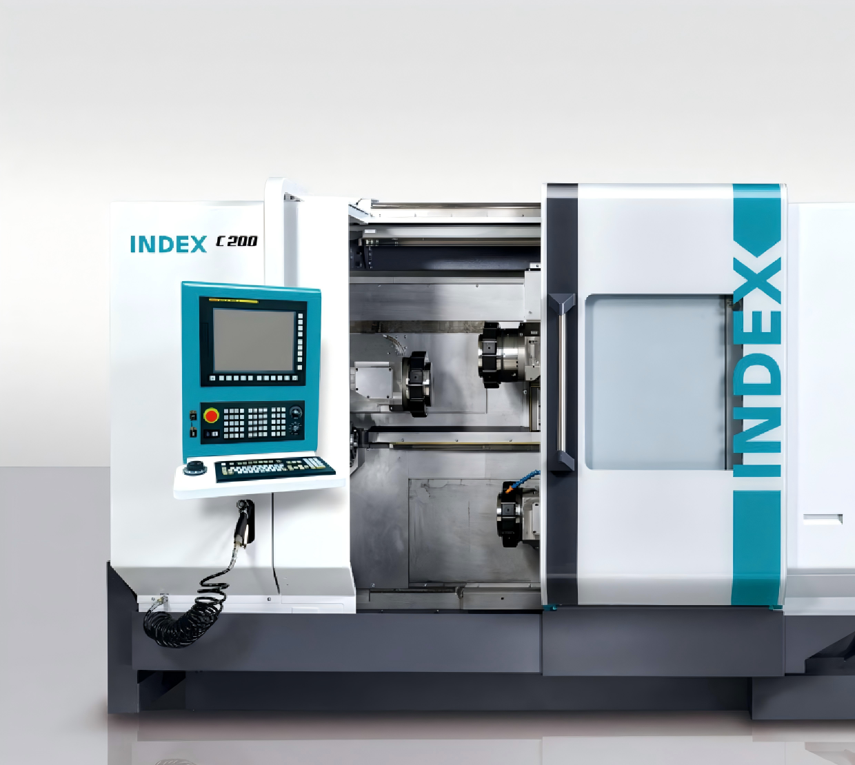 INDEX C200车削中心:适用于使用棒料高速车削生产零件,两个动力强劲的电主轴保证了金属切削的高效率,副主轴快速移动速度可达50米/分钟。可配备2或3刀塔,42个刀位和具有专利设计的W型刀具定位槽,缩短了调整时间。机床的垂直床身保证了排屑流畅,工件自动卸料系统为龙门式集成工件卸料装置,保证了快速卸料。