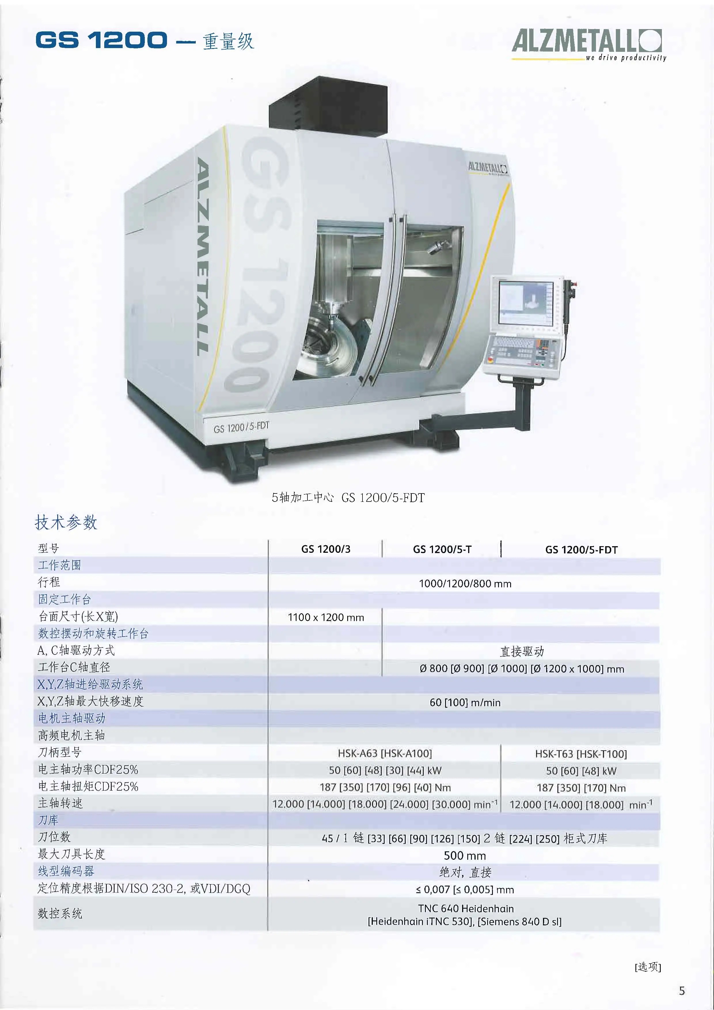 德国奥美特ALZMETALL机床GS 1000/5 工作台中心孔 ? 50 H7 mm,工作台承重 1000 kg,A 轴间的回转范围 ? 1070 mm,工作台可装卡工件直径 ? 930mm,工作台端面位于 A 轴以下 100 mm。这些尺寸参数使得该机床能够适应多种不同规格和重量的工件加工,具备较强的通用性和实用性。