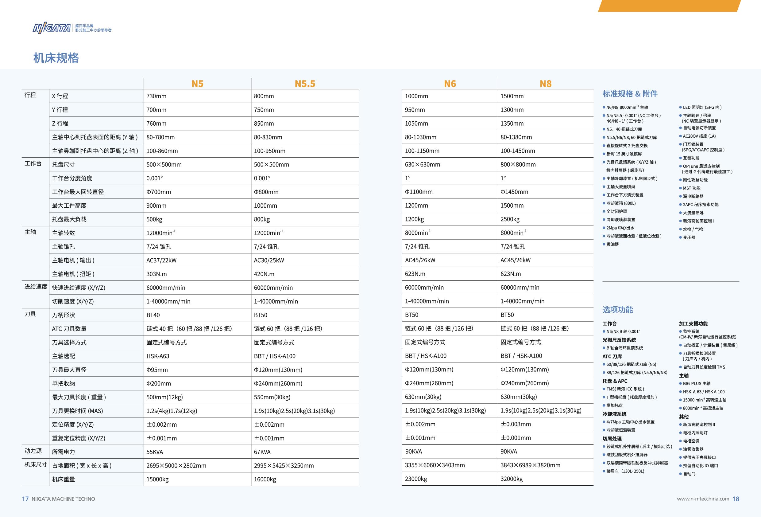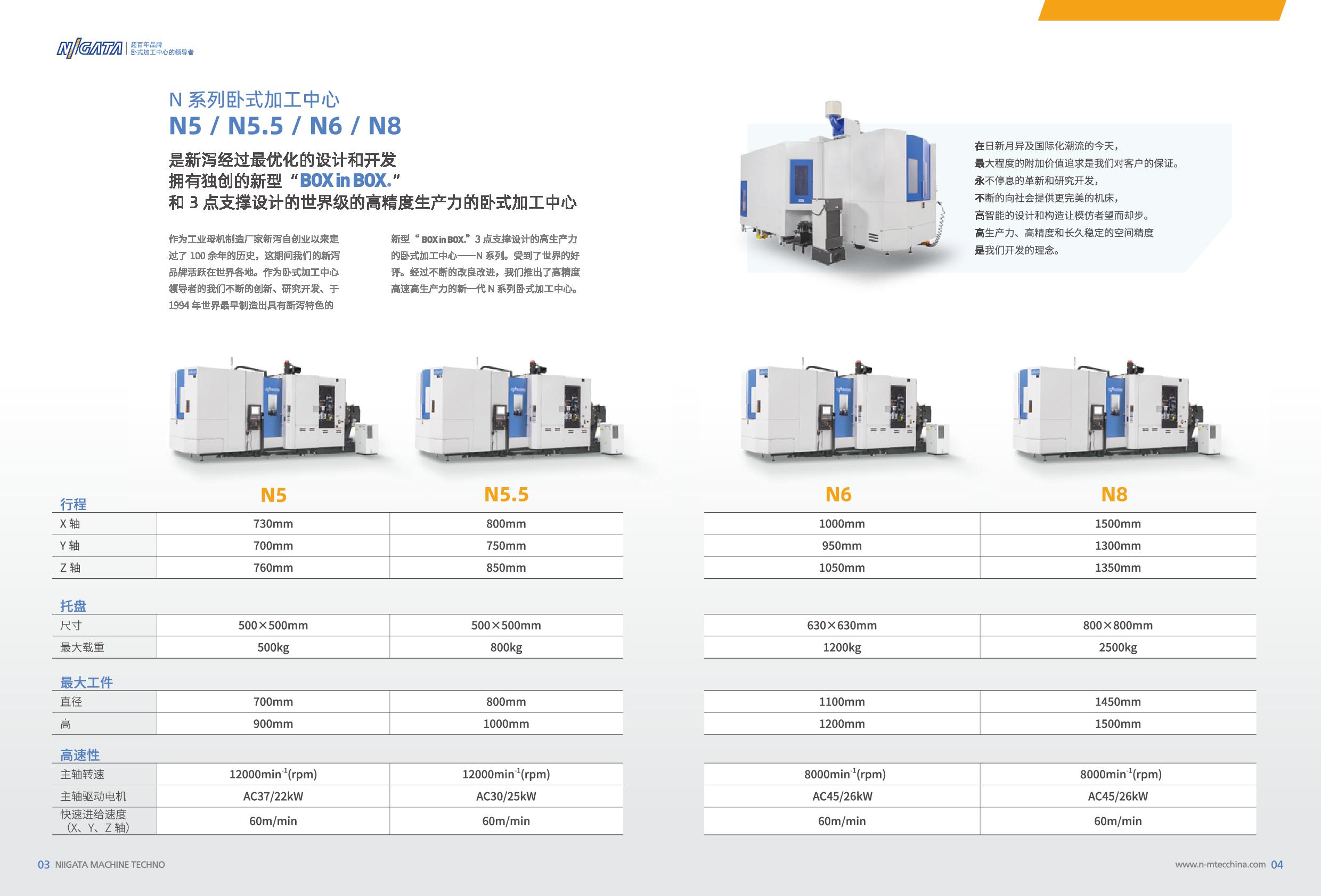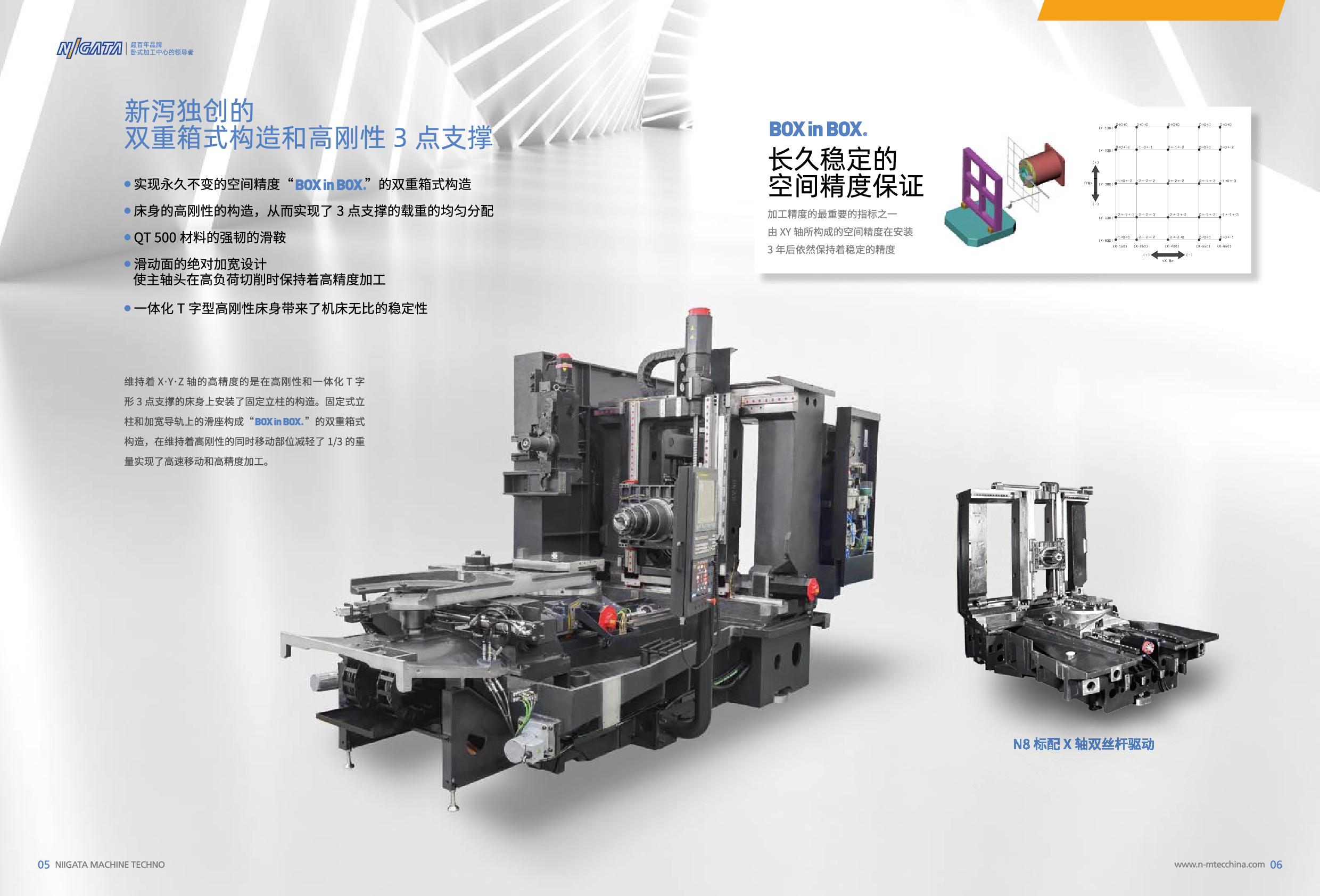 卧式加工中心?:主打N5/N5.5/N6/N8系列,采用?BOXinBOX双重箱体结构?和高刚性滚柱导轨,标配37Kw高扭矩主轴(可选15000转/分),支持500mm长刀具及自动化接口?。