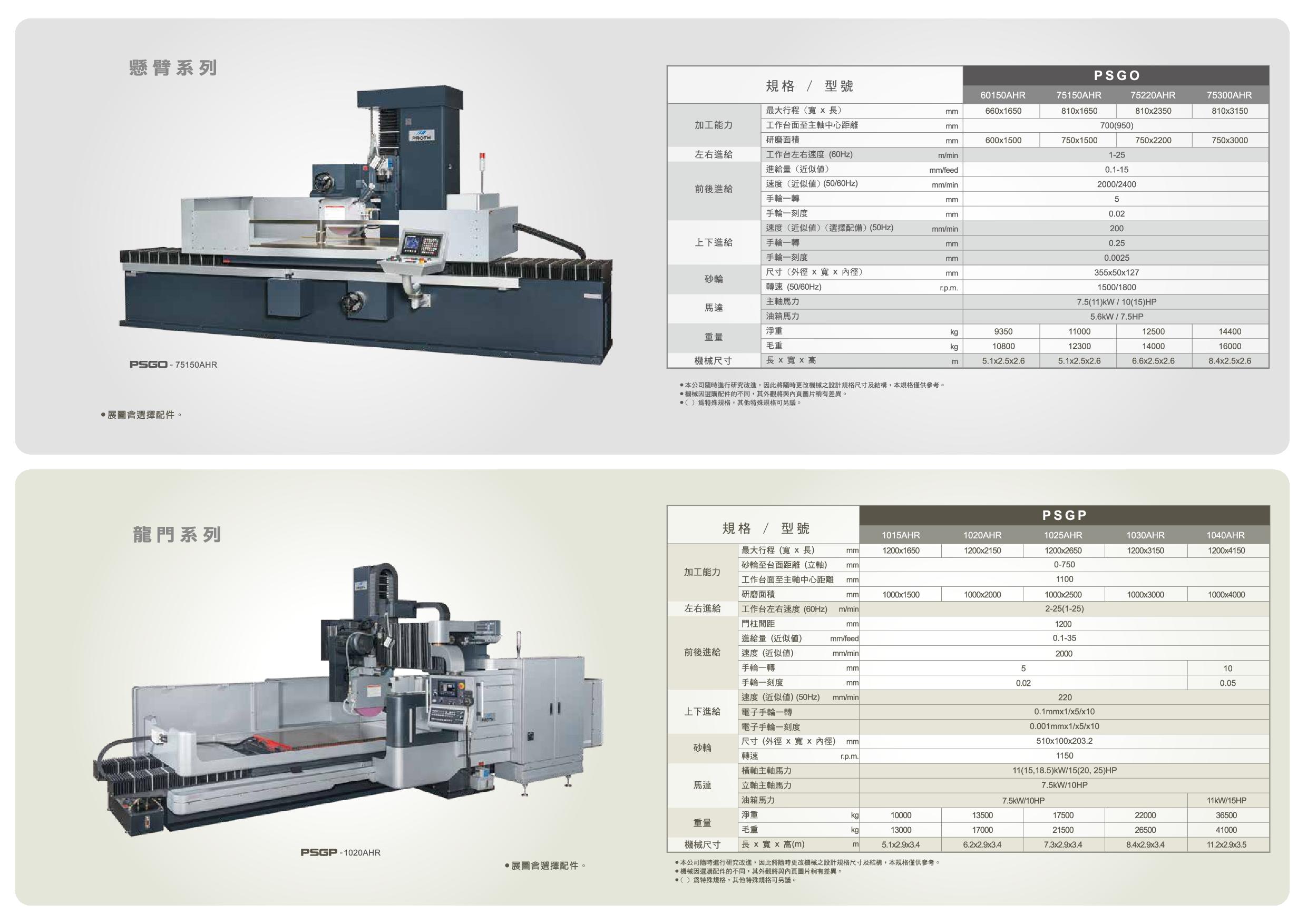 伸臂式平面磨床(PSGO 系列):前后鸠尾滑道、左右双 V 滑道组合,兼顾灵活与稳定。油压驱动左右进给,前后自动,上下可快速或手动,还可选配上下自动进给,适用于特殊空间、大面积磨削,如大型模具局部加工。