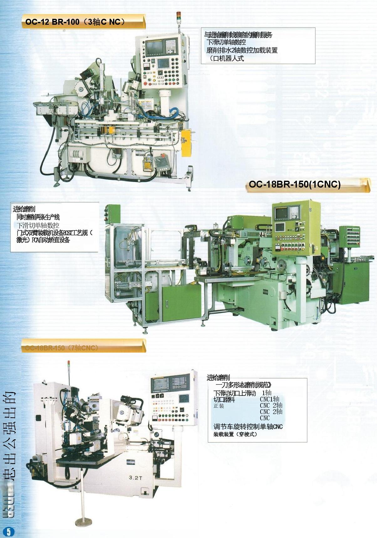 OC-18BR-150 (7 轴CNC):横向进给方式磨削,1 - 切断多形式磨削规格,下滑板进给 1 轴CNC,上滑板进给 1 轴CNC,磨削修整 2 轴CNC,调整修整 2 轴CNC,导轮控制 1 轴CNC,上下料 (往复型)。