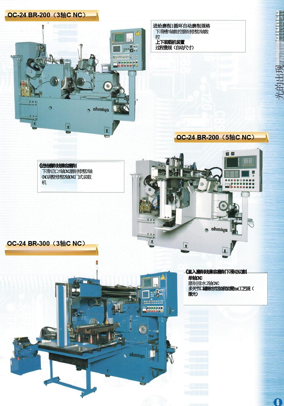 OC-24BR-200:有 3 轴CNC和 5 轴CNC两种规格。3 轴CNC型为横向进给磨削单循环自动磨削规格,下滑板进给 1 轴CNC,磨削砂轮修整 2 轴CNC,上下料装置,自动测量尺寸;5 轴CNC型为横向进给磨削方式,能对应生产线的磨削规格,下滑板进给 1 轴CNC,磨削修整 2 轴CNC,调整修整 2 轴CNC,门型上料装置。