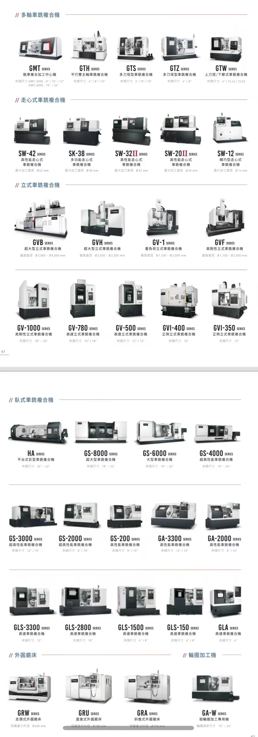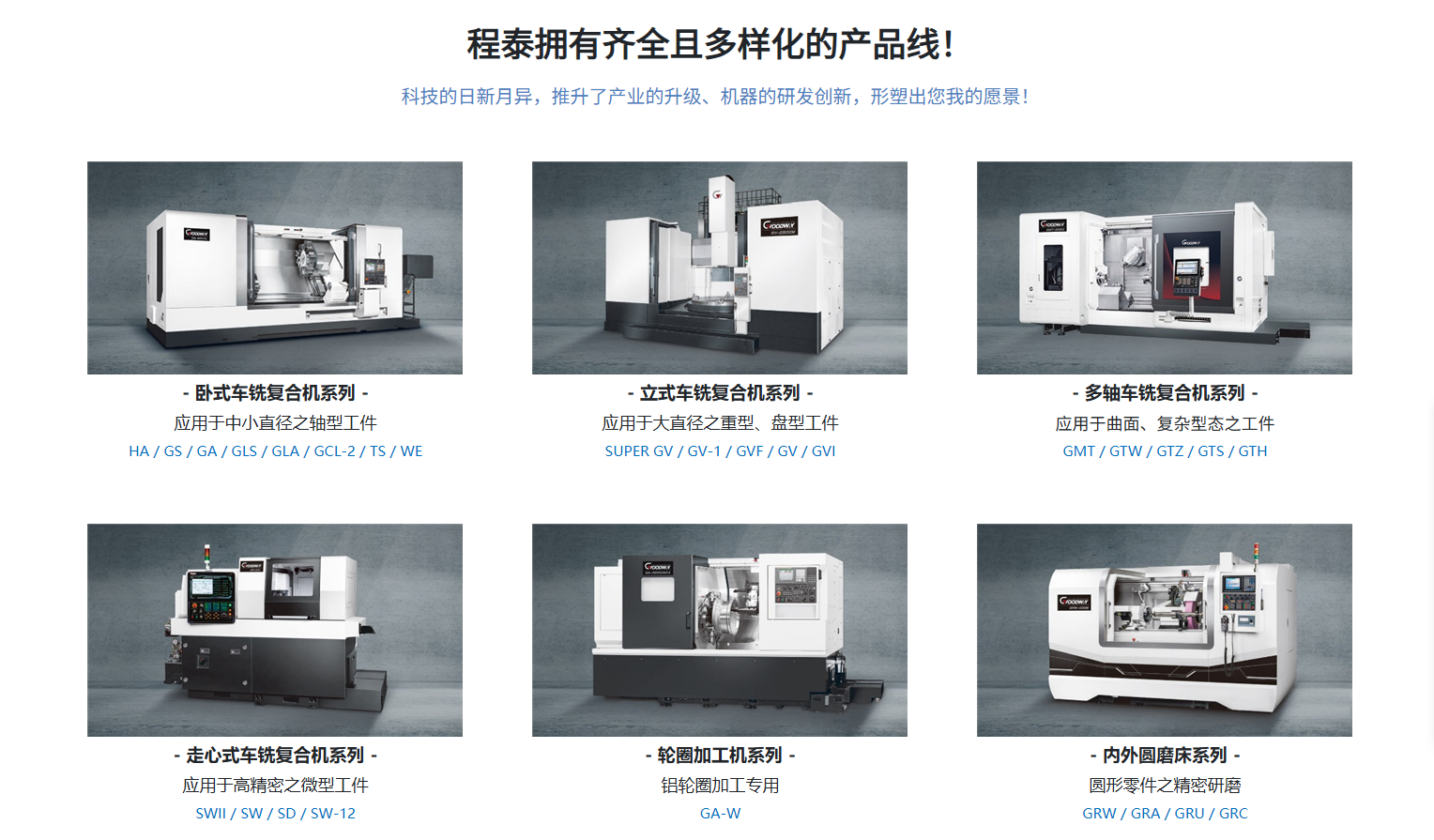 产品种类:程泰机床产品种类丰富,包括卧式车床、立式车床、多轴式车床、走心式车床等。其中卧式车床有GLS系列、HA系列等;立式车床有GV系列、GVF系列等;多轴式车床有GTZ系列、GTS系列等;走心式车床有SD系列、SW系列等。此外,还有轮圈加工机、立式加工机、外圆磨床及中心孔磨床等产品。
