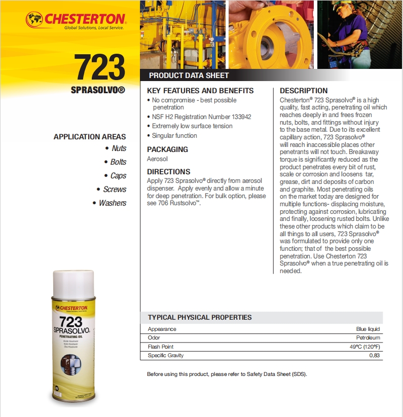 Chesterton® 723 Sprasolv®是一款高品质速效渗透油,能深层渗透并轻松松动锈死的螺母、螺栓及连接件,且不会损伤基体金属。凭借的毛细作用力,本产品可到达其他渗透剂无法触及的隐蔽部位。当产品完全渗透锈层、氧化皮或腐蚀物后,可显著降低拆卸扭矩,同时能有效分解沥青、油脂、污垢以及碳石墨沉积物。目前市面多数渗透油均为多功能设计——兼具除湿、防腐、润滑及除锈功能。与其他宣称""的产品不同,723 Sprasolv®专为单一功能研发:实现渗透效果。当您需要真正的渗透油时,请选择Chesterton 723 Sprasolv®。