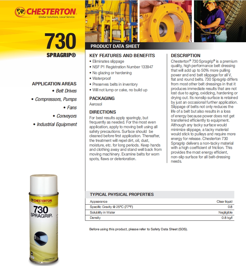 Chesterton® 730 Spragrip® 是一款高性能皮带润滑剂,可为V型带、平皮带及圆带提升高达50%的牵引力并打滑问题。与传统产品不同,730 Spragrip 能即时生效且效果持久,不会因氧化、硬化或干涸而失效,仅需定期补喷即可维持防滑表面。皮带打滑不仅缩短使用寿命,还会造成能量损耗。普通粘性涂层虽能减少打滑,但易粘连皮带轮并增加能耗。730 Spragrip 非粘性高摩擦系数配方,以能效实现全方位防滑保护。