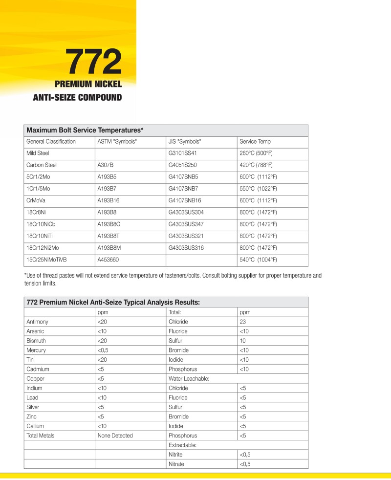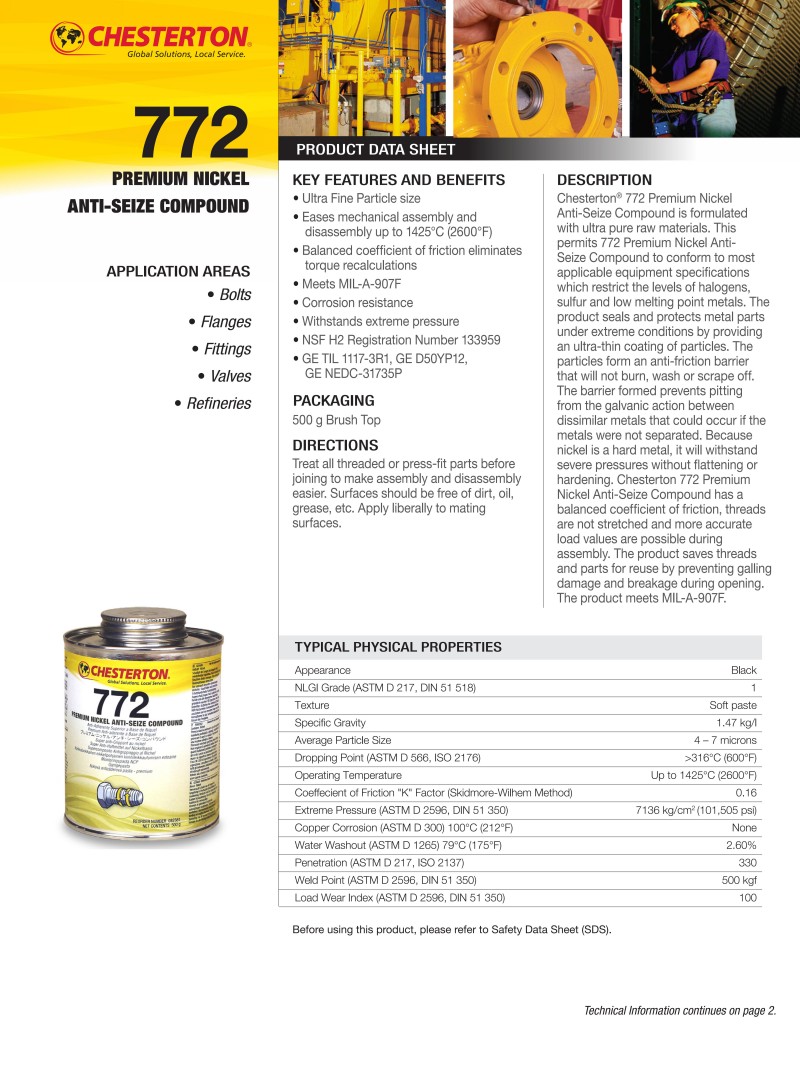 Chesterton® 772镍基防卡剂采用超高纯度原材料配制而成,能够满足大多数设备规范对卤素、硫和低熔点金属含量的限制要求。该产品在极端条件下通过形成超薄颗粒涂层,对金属部件进行密封和保护。这些颗粒形成的抗摩擦屏障不会燃烧、冲刷或刮落,可防止异种金属间因电偶腐蚀而产生的点蚀。由于镍是一种硬金属,它能够承受极高压力而不会压平或硬化。Chesterton 772镍基防卡剂具有平衡的摩擦系数,装配时不会拉伸螺纹,并能实现更的负载值。该产品通过防止咬合损伤和拆卸时的断裂,保护螺纹和部件以便重复使用。产品符合MIL-A-907F标准。