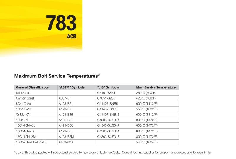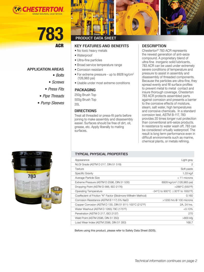 Chesterton® 783 ACR代表了新一代防卡剂。该产品采用专利配方的超细无机固体润滑剂混合物,可在极端温度和压力条件下使用,帮助螺纹部件的组装和拆卸。由于颗粒超细,产品能均匀分布并填充表面轮廓,防止金属间直接接触,确保全面覆盖。Chesterton 783 ACR能保护组装部件免受腐蚀,并抵御湿气、蒸汽、盐水、高温和腐蚀性化学品的侵蚀。在标准腐蚀测试ASTM B-117中,783提供的防锈保护时间是传统防卡剂的20倍。在耐水冲刷性方面,783几乎可以视为完全防水。因此,即使在海洋、化工厂或金属冶炼等恶劣环境中,也能实现长期稳定的性能。