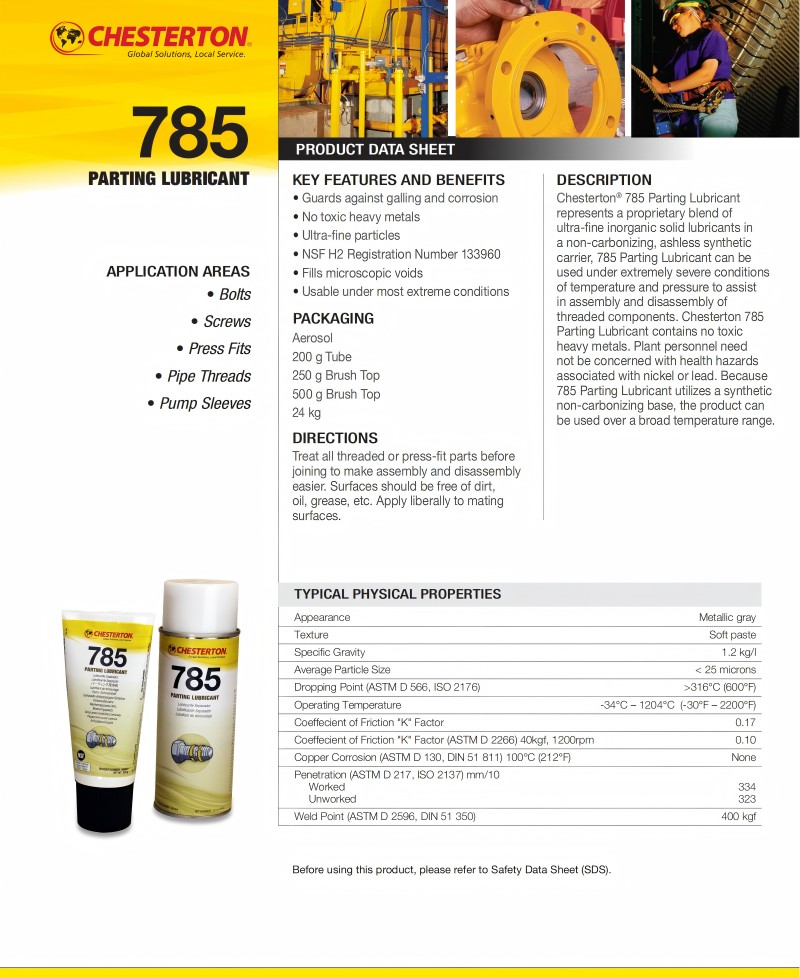Chesterton® 785 分离润滑剂是一种专利配方的超细无机固体润滑剂,采用无碳化、无灰合成载体。785 分离润滑剂可在极端温度和压力条件下使用,帮助螺纹部件的组装和拆卸。Chesterton 785 分离润滑剂不含任何有毒重金属,工厂人员无需担心与镍或铅相关的健康危害。由于 785 分离润滑剂采用无碳化合成基底,该产品可在广泛的温度范围内使用。