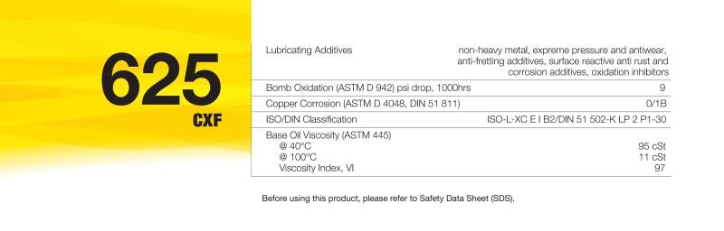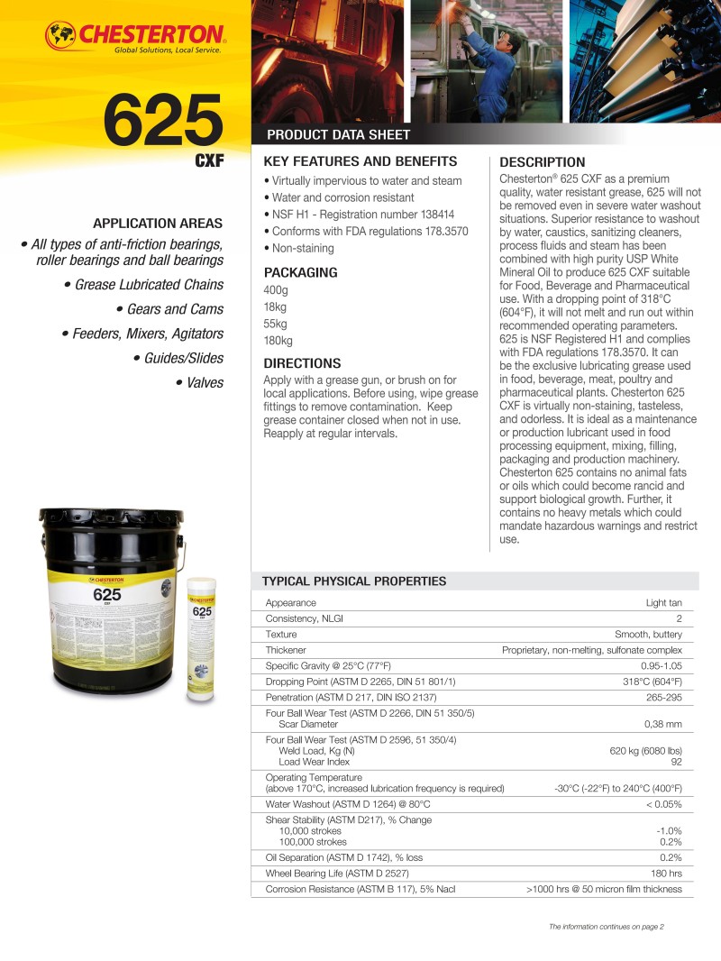 CHESTERTON® 625 CXF是一款高品质防水润滑脂,即使在极端水冲条件下仍能保持性能。其的抗水、抗腐蚀、抗清洁剂及蒸汽冲刷能力,结合高纯度USP白矿物油,适用于食品、饮料及制药行业。滴点高达318°C(604°F),在推荐操作参数内不会熔化流失。通过NSF H1注册并符合FDA 178.3570法规,可安全用于食品、肉类、禽类及制药设备。本品无动物油脂,避免及微生物滋生,且不含重金属,无需危险警示。