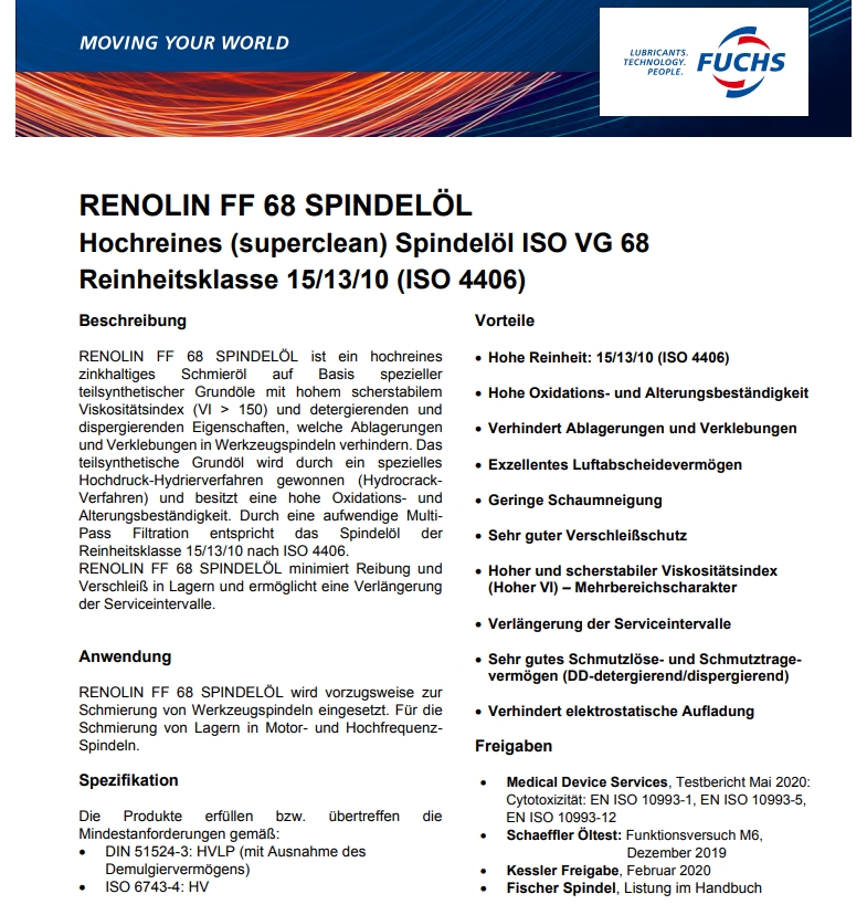 德国FUCHS RENOLIN FF 68是基于特殊半合成基础油的高纯度锌润滑油,具有高剪切稳定性粘度指数(VI 150)和洗涤和分散特性,可防止刀具主轴中的沉积和粘附。部分合成基础油是通过特殊的高压加氢工艺(Hydro裂纹工艺)获得的,具有很高的抗氧化性和抗老化性。RENOLIN FF 68主轴油可限度地减少轴承的摩擦和磨损,并延长服务间隔。