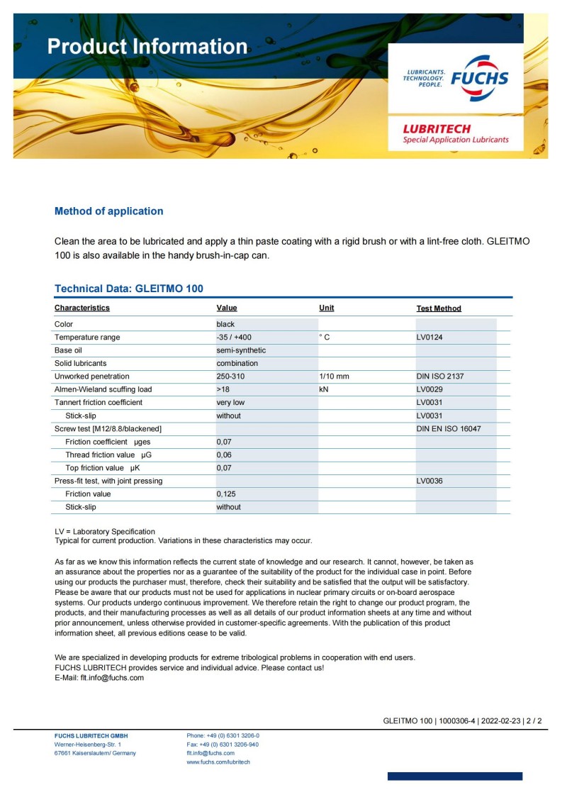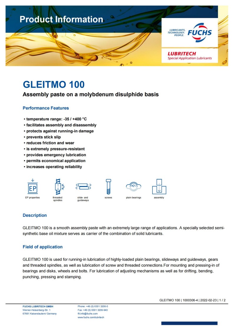 GLEITMO 100 是一种光滑的装配膏,具有极其广泛的应用范围。其载体为一种特殊配制的半合成基础油混合物,内含固体润滑剂组合。