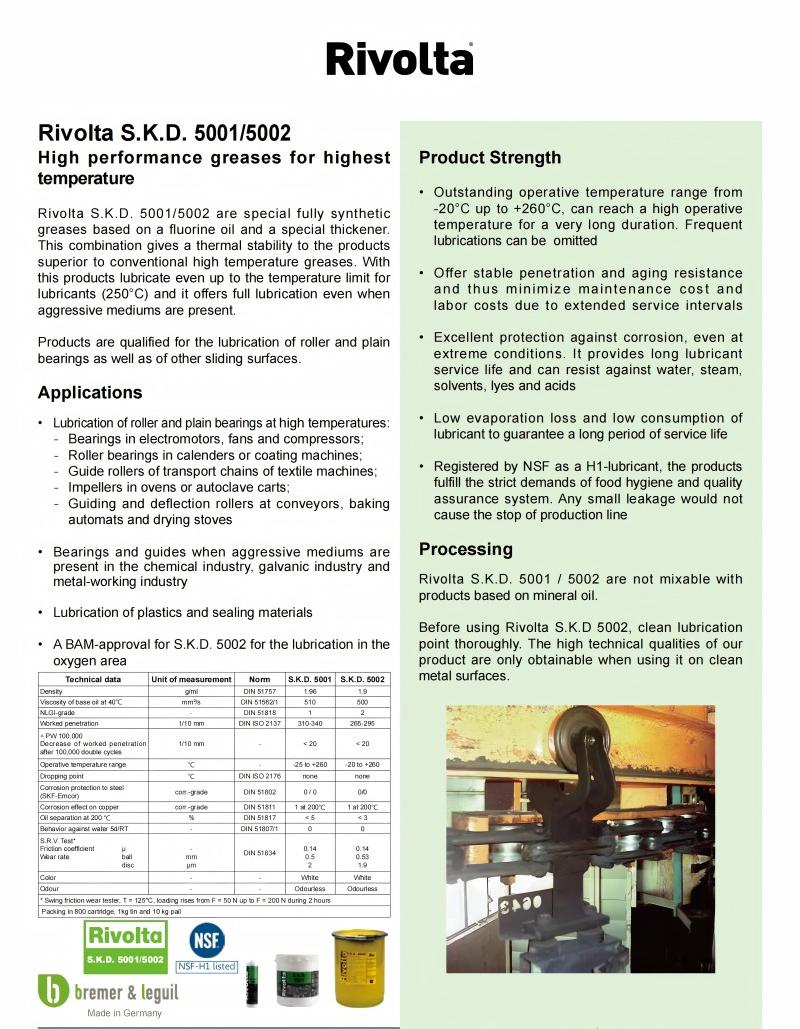 Rivolta S.K.D. 5002 是采用氟油和特殊增稠剂合成的特种润滑脂。这种组合赋予产品的热稳定性,性能远超传统高温润滑脂。即使在润滑剂的温度极限(250°C)下,该产品仍能提供充分润滑,并在存在腐蚀性介质的环境中保持优异性能。