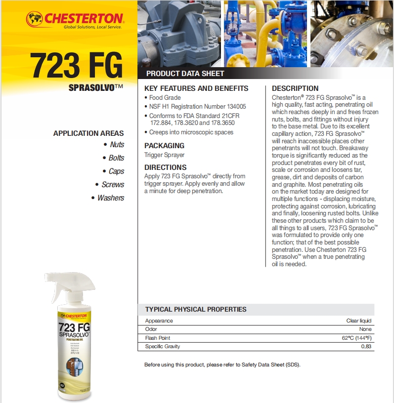 市面上多数渗透油追求多功能——除湿、防腐、润滑兼松动,而723 FG Sprasolvo 专为单一目标研发:实现渗透性能。当您需要真正的渗透油时,请选择Chesterton 723 FG Sprasolvo。