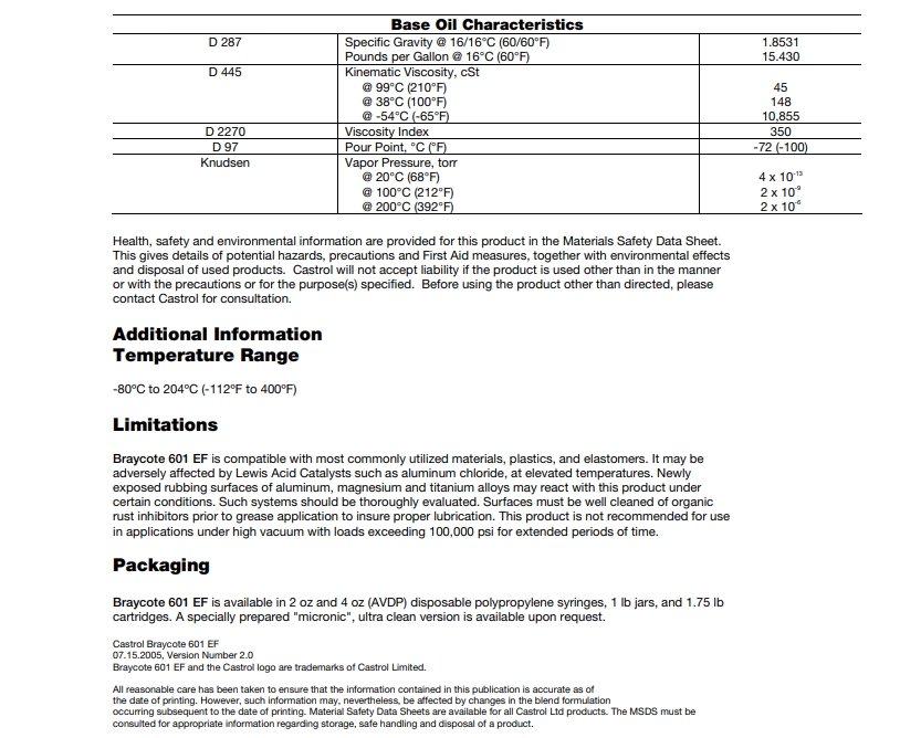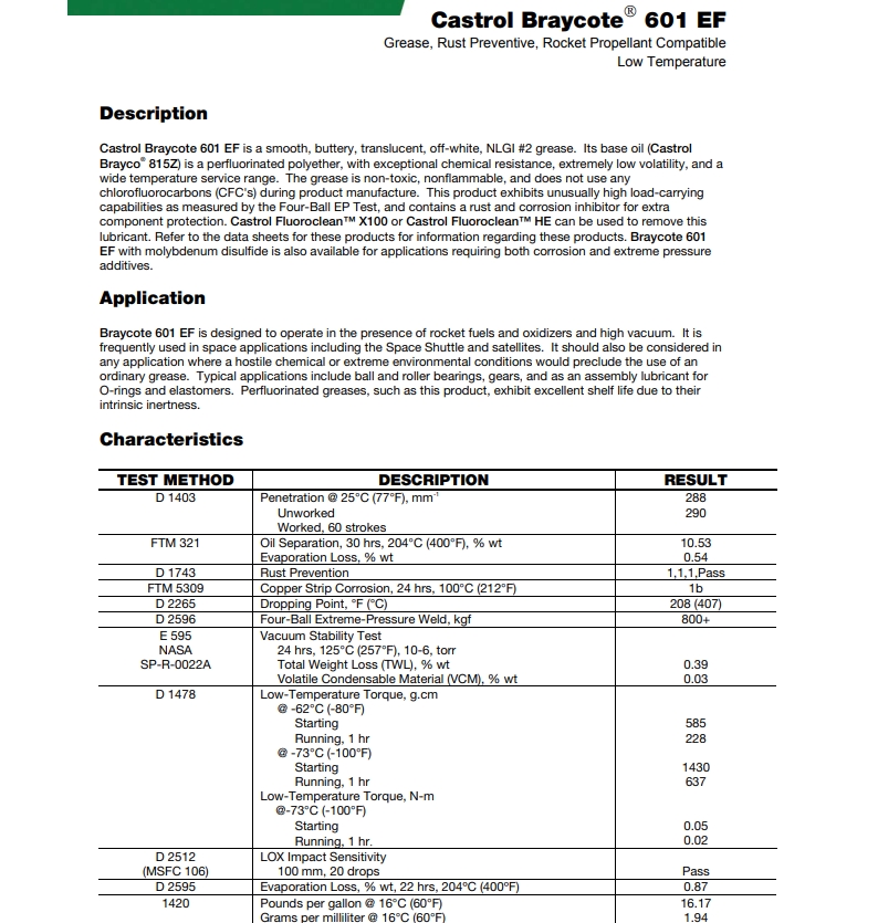 嘉实多Braycote 601 EF 是一种光滑、奶油状、半透明的浅白色NLGI2润滑脂。它使用嘉实多Brayco 815Z作为基础油,四端基作为增稠剂。它们是在燃料、氧化剂存在下和在深空真空应用中配制而成。它们用于齿轮、球和滚子轴承、电接触,以及作为“0”环和弹性体的装配润滑剂。常用于航天应用,包括航天飞机和卫星,以及在任何敌对化学或极端环境条件会阻止使用普通润滑脂的应用中。