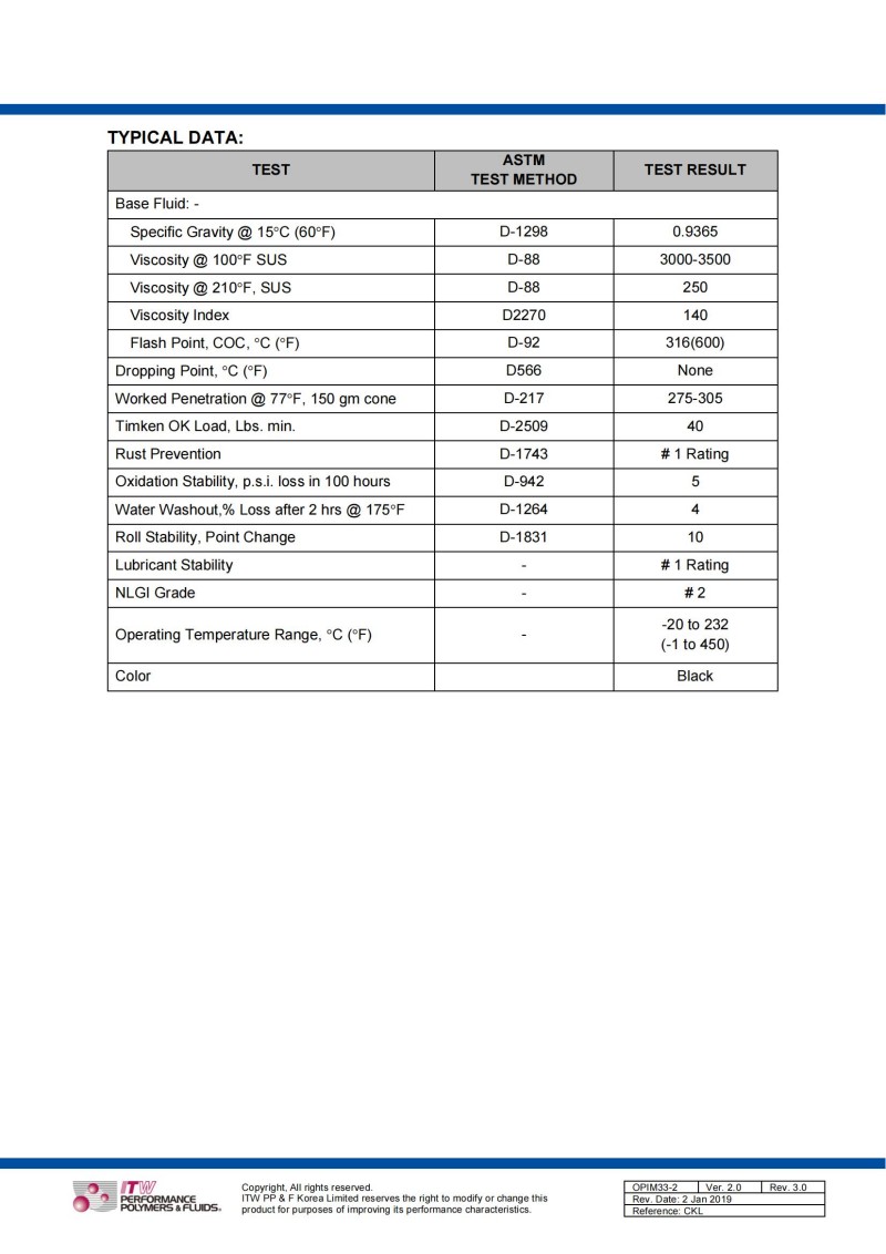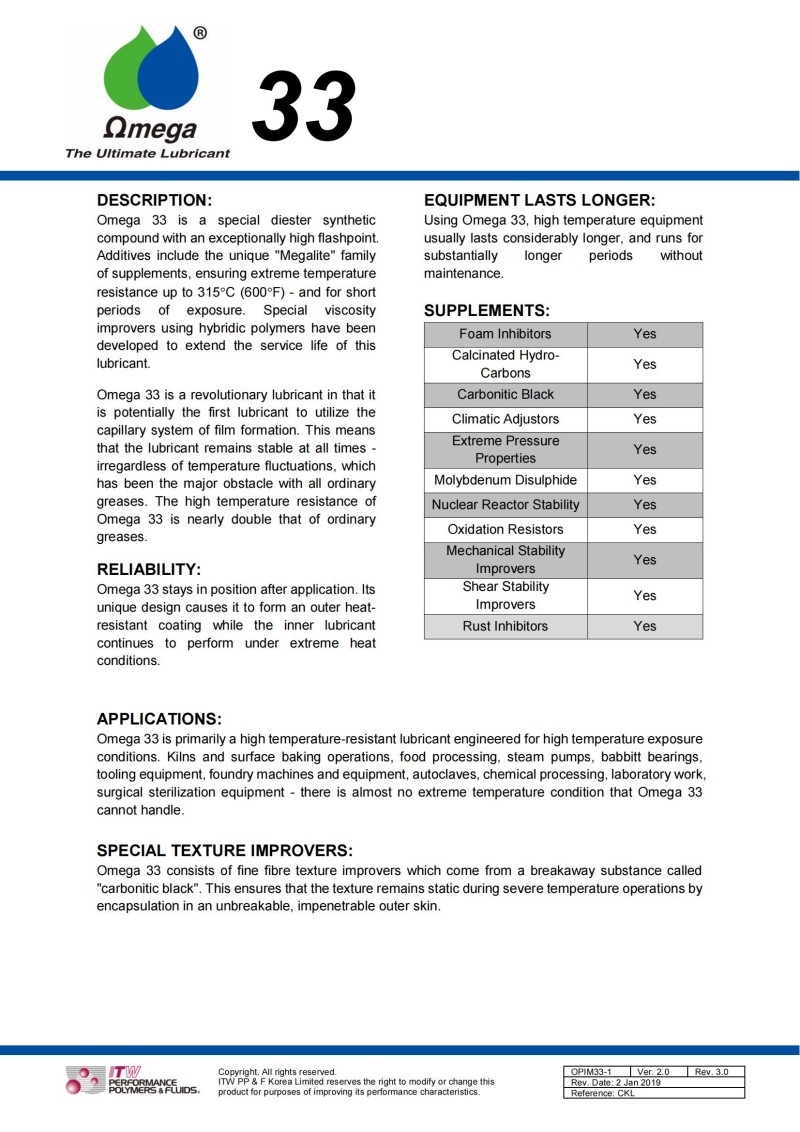 Omega 33是一种特殊的双酯合成化合物,具有极高的闪点。其添加剂包含独特的“Megalite”系列成分,可承受高达315°C(600°F)的极端温度,并能在短时暴露下保持性能。通过混合聚合物开发的特殊粘度改良技术,进一步延长了该润滑剂的使用寿命。