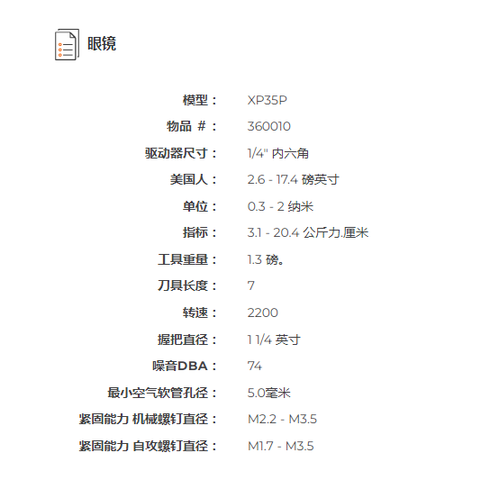 XP35P 式气动螺丝刀适用于高产量拧紧应用。它通常用于垂直操作。该气动螺丝刀以实惠的价格为装配和制造应用提供耐用性、动力和速度。气动螺丝刀专为安全操作和提高操作员舒适度而设计,与同类气动工具相比,噪音分贝更低,对操作员的振动最小,扭矩反作用力小。该气动工具采用专利离合器设计,可通过可重复的扭矩控制提供可靠的精度。离合器机构在达到预设扭矩设置后关闭气源,防止出现过扭矩情况。