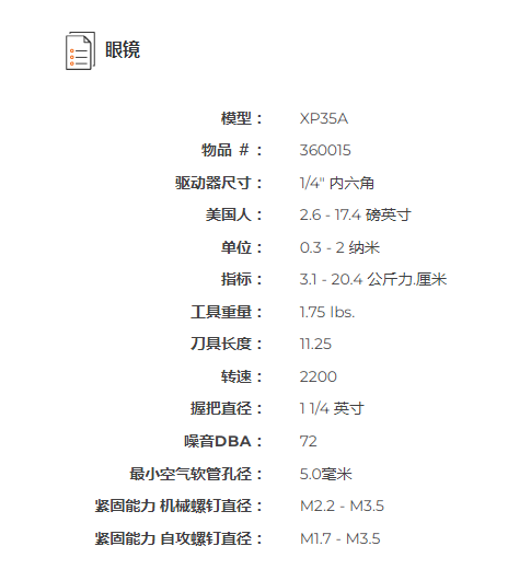 XP35A直角空气螺丝刀是用于高产量的紧缩应用。该工具为难以到达的紧固件提供了在狭窄空间的通道。该空气螺丝刀提供了耐久性,功率和速度的装配和制造应用以负担得起的价格。为安全操作和增加操作人员的舒适性而设计的气动螺丝刀比比较的航空工具提供更低的噪音分贝,操作人员的振动和低转矩反应最小。该空气工具的特点是专利离合器设计,提供可靠的准确性与可重复转矩控制。离合器机构在达到预先设定的转矩设置后关闭了空气供应,防止发生过转矩情况。