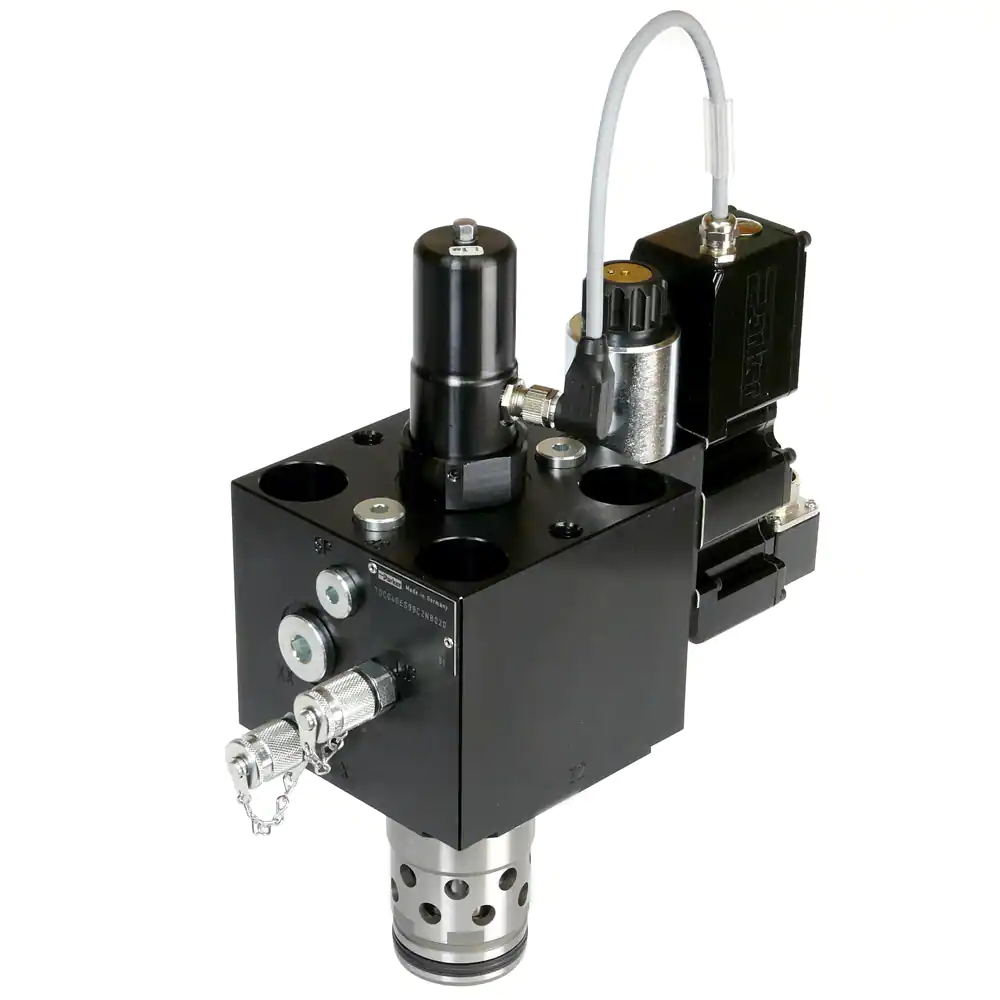 附加集成的电磁方向阀提供安全功能,当其电磁铁失电时,其阀芯处于弹簧偏置的位置,从X口来的先导压力将控制活塞推压至下端位置,主阀芯关闭,结果从B到A或从回油系统到机器的液流被关闭。