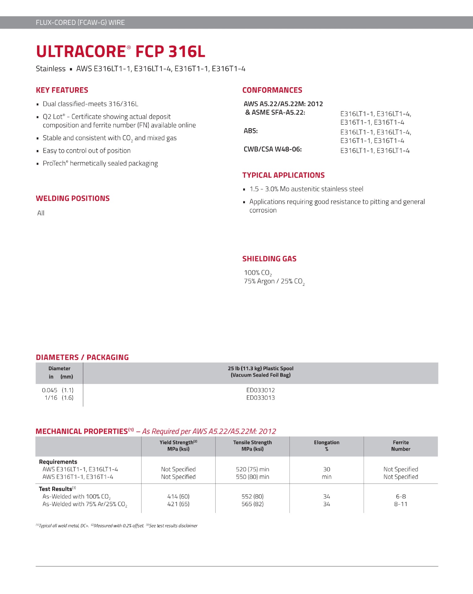 符合:AWS:A5.22/A5.22M:1995 E316LT1-1/E316LT1-4/E316T1-1/E316T1-4
