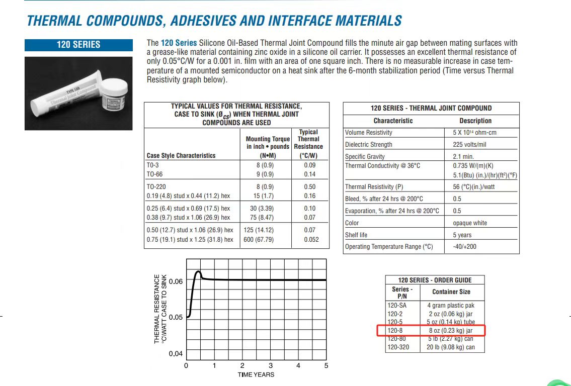型号120-8散热膏。120-8型号的散热膏是由Wakefield Solutions生产的,主要成分是硅油基热传导复合物,含有氧化锌颗粒。它的导热性能优异,0.001英寸厚的薄膜在1平方英寸的面积上,导热热阻仅为0.05°C/W。
