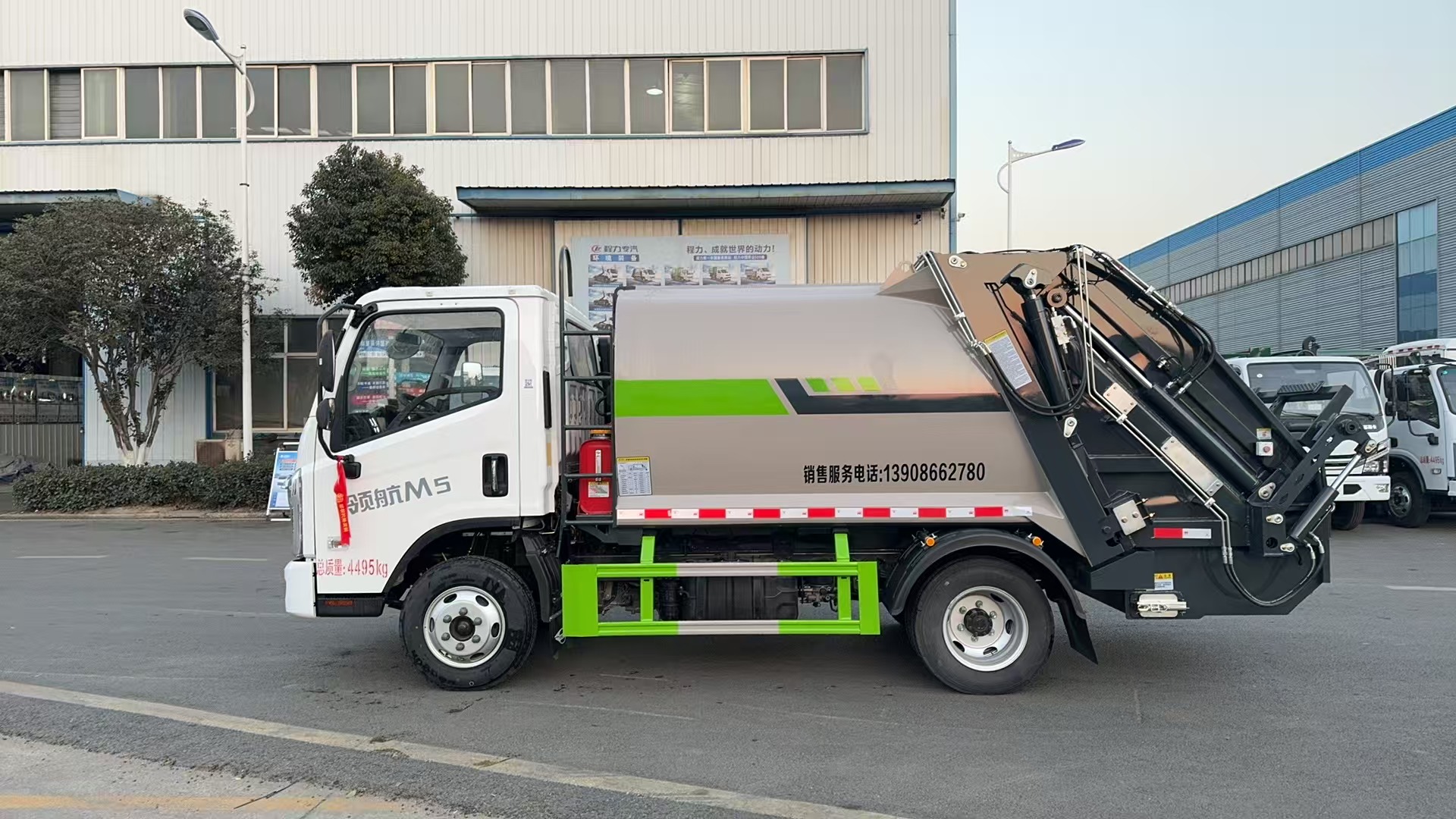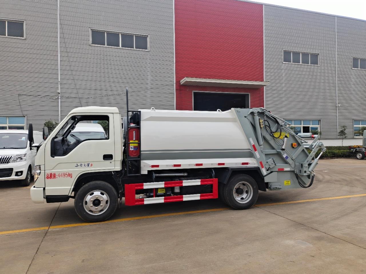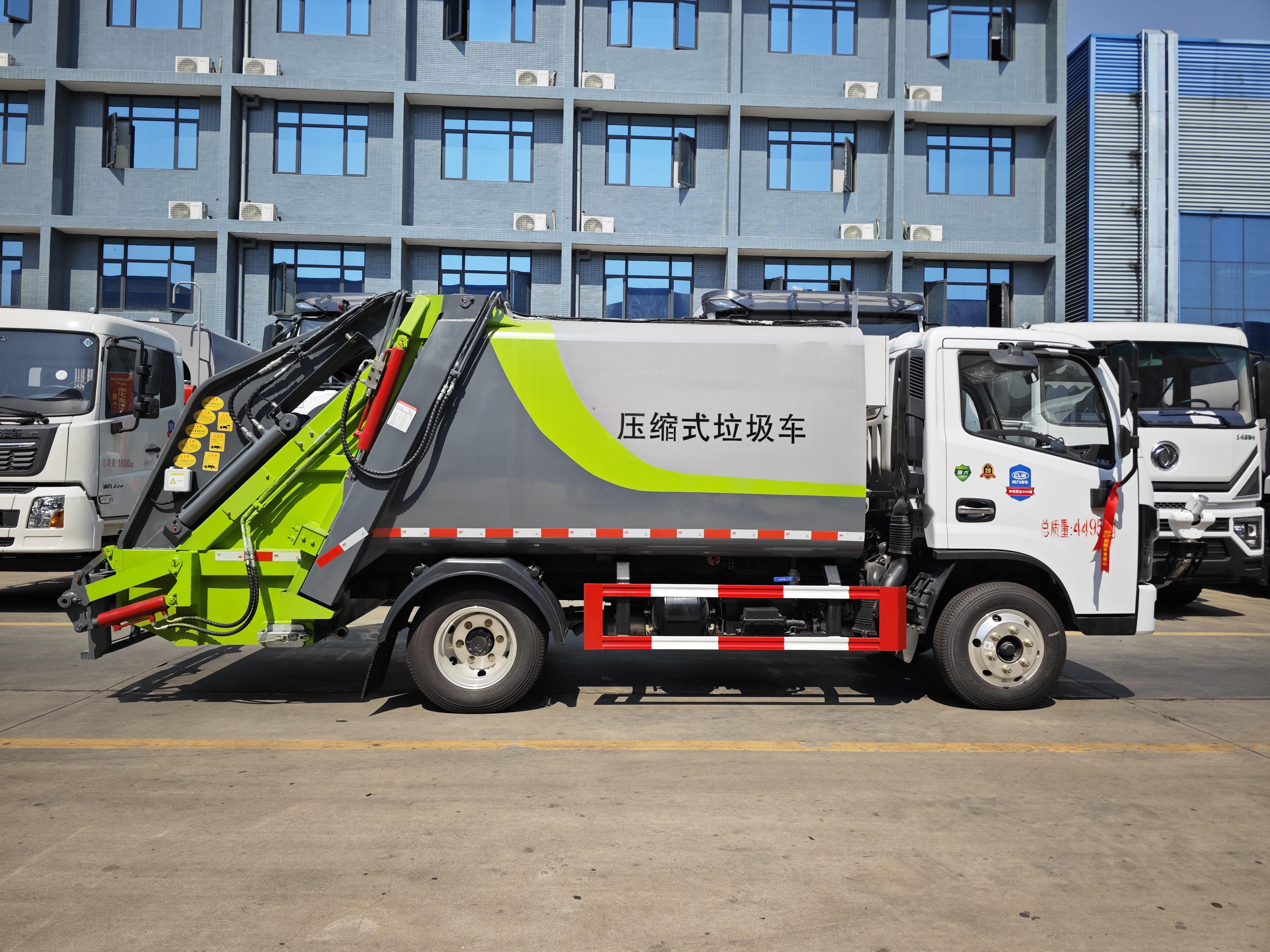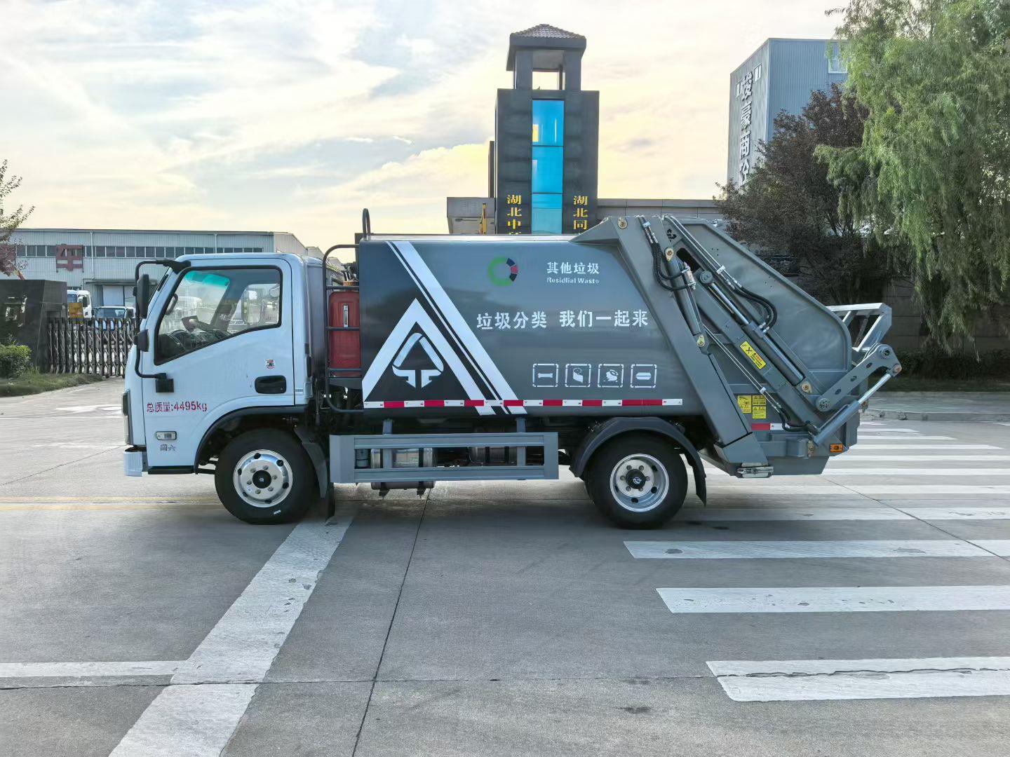 箱体容积为6.2立方米含填装器,弧形箱体,高强度钢制作,湖北恒力配套油缸、标配单皖液油泵、嘉善取力器,扬州中梅多路阀 ,后带翻桶架,可挂2只国标240L方塑料桶。