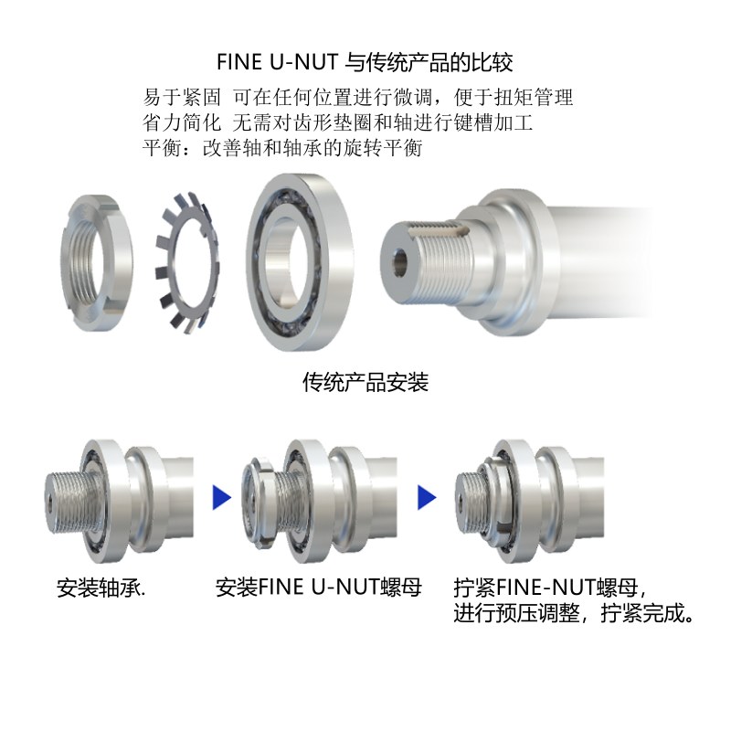 “FINE U-NUT”可不受带齿垫圈的限制任意、适宜地定位,同时扭矩管理也很容易。其不需要轴的键槽加工、也不需要带齿垫圈的安装技术,是划时代的轴承用防松螺母。能提高为所有产业机械提供“动力”的轴承的旋转平衡。并且,还实现了设备旋转损耗以及耗电量的减少。