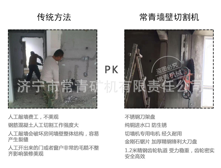 优势:目前在建筑装修行业中,大多还是采用敲墙的手段来开门/开窗户,这种方法弊端非常大,首先他破坏了房间墙壁的整体机构,敲不好墙壁会出现裂缝;其次开出来的门或者窗户非常的毛糙不整齐影响装修美观.利用我们的墙体切割机就不会出现以上问题.而且现在城市中的建筑质量越来越高,高标号的水泥加上钢筋的墙体,普通的打孔、锤敲几乎无法开展施工。利用我们的产品将很好的解决以上问题,可以给用户带来满意的效果,也给您带来巨大的经济效益。