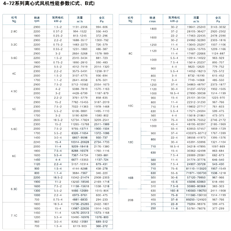 1、通风机按气流进气分为单吸入和双吸入两种,单吸入式机号有:No2.8、3.15、3.55、4、4.5、5、6.3、8、10、12.5、16、20等十二个机号;双吸入式机号有:No2-5、2-6、2-7、2-8、2-10、2-12.5共6种,0系列总计18种。