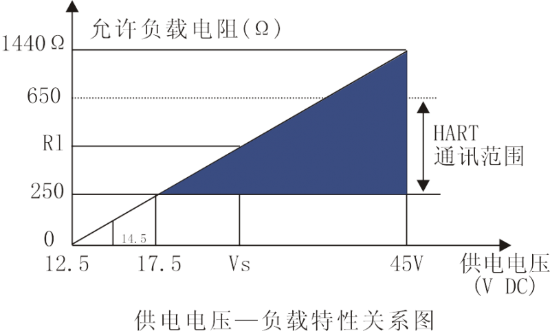 零点与量程调整要求 ·零点与量程可在表1中所标明的量程极限值内任意调整。·量程必须大于或等于表1中所标明的***小量程 应用场合 液体,气体与蒸汽的测量场合 输出二线4-20mA,用户可选线性输出或平方根输出。数字过程变量叠加于4-20mA信号上,适用于任何符合HART协议的主机。 电源需要外部电源。标准变送器(4-20mA)空载时工作在 14.5-45V dc。 回路负载极限 回路电阻由外部电源供电电压决定,关系如下: