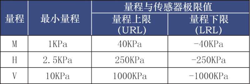 静压影响 ±0.15%/10MPa量程上限 零点影响 可根据现场安装位置等重新就地修正零位,或进行压力零位迁移。 阻尼时间常数 总阻尼时间常数等于放大器部件和膜盒的阻尼时间常数之和。放大器组件阻尼时间常数在0~100秒范围可调。膜盒(硅油) 时间常数(秒)(可根据现场实际情况设置时间常数,推荐1S) 安装位置影响 与膜片面平行方向的安装位置变化不会造成零漂影响,若安装位置与膜片面超过90°的变化,在0.4KPa范围内的零漂可通过调零校正,不影响量程。电源影响 小于±0.005%量程/伏 功能指标 量程与传感器极限值 表1.361D型变送器量程与传感器的极限值