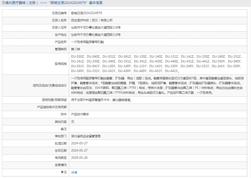 一次性使用输尿管导引鞘由鞘管、扩张器、导丝(选配)组成。鞘管根据接头型式分为直型和Y型,其中直型鞘管由直型接头、硅胶保护套、鞘管管体组成,Y型鞘管由硅胶盖帽、护帽、Y型接头、硅胶保护套、鞘管管体组成,扩张器由扩张器接头、扩张器管体组成。鞘管管体由尼龙、304不锈钢、聚四氟(PTFE)制成,带亲水涂层;扩张器管体由聚(PE)材料制成;导丝芯丝由镍钛合金材料制成,包塑层由聚四氟(PTFE)材料制成,导丝头端型式为直头。产品经环氧灭菌,一次性使用。