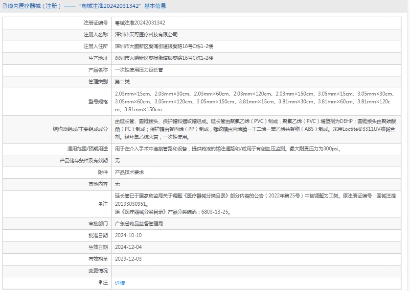 由延长管、圆锥接头、保护帽和螺纹帽组成。延长管由聚(PVC)制成,聚(PVC)增塑剂为DEHP;圆锥接头由聚碳酸酯(PC)制成;保护帽由聚(PP)制成,螺纹帽由一一共聚物(ABS)制成。采用Loctite®3311UV胶黏合剂。经灭菌,一次性使用。