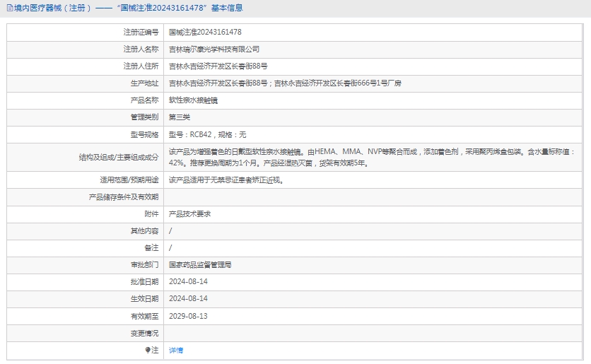 该产品为增强着色的日戴型软性亲水接触镜。由HEMA、MMA、NVP等聚合而成,添加着色剂,采用聚盒包装。含水量标称值:42%。推荐更换周期为1个月。产品经湿热灭菌,货架有效期5年。