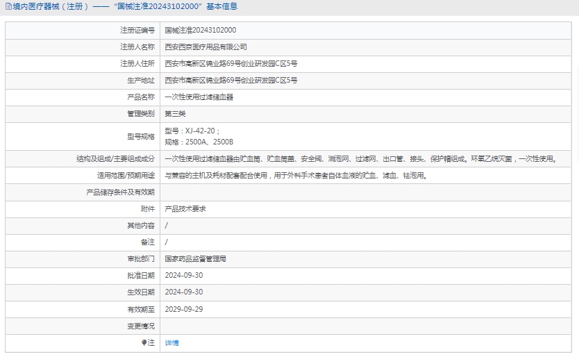 一次性使用过滤储血器由贮血筒、贮血筒盖、安全阀、消泡网、过滤网、出口管、接头、保护帽组成。灭菌,一次性使用。