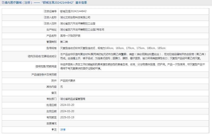 灭菌型连体式和非灭菌型连体式,规格为160cm、165cm、170cm、175cm、180cm、185cm