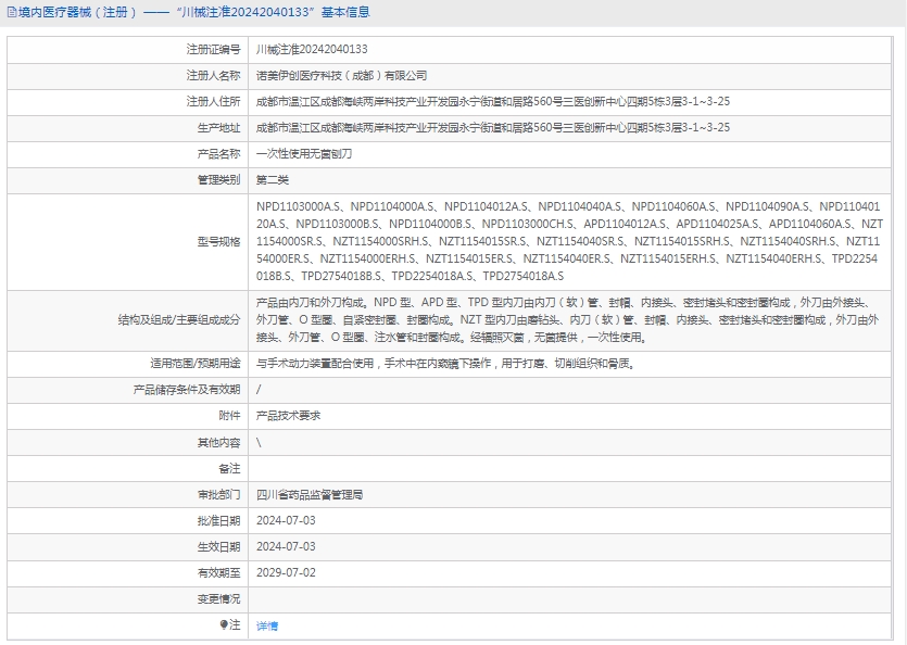 产品由内刀和外刀构成。NPD 型、APD 型、TPD 型内刀由内刀(软)管、封帽、内接头、密封堵头和密封圈构成,外刀由外接头、外刀管、O 型圈、自紧密封圈、封圈构成。NZT 型内刀由磨钻头、内刀(软)管、封帽、内接头、密封堵头和密封圈构成,外刀由外接头、外刀管、O 型圈、注水管和封圈构成。经辐照灭菌,无菌提供,一次性使用。