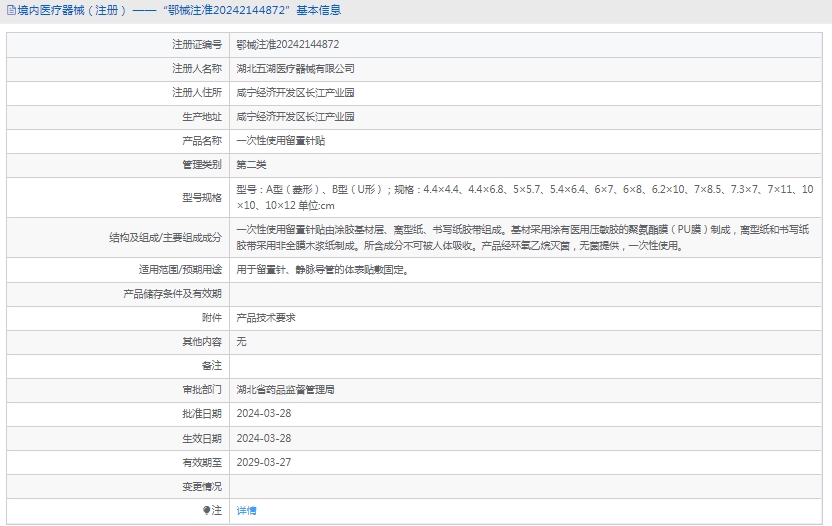 一次性使用留置针贴由涂胶基材层、离型纸、书写纸胶带组成。基材采用涂有医用压敏胶的聚氨酯膜(PU膜)制成,离型纸和书写纸胶带采用非全膜木浆纸制成。所含成分不可被人体吸收。产品经灭菌,无菌提供,一次性使用。