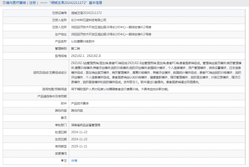 ZKZLRZ-I由管理员端,医生端,患者PC端组成;ZKZLRZ-II由管理员端,医生端,患者PC端,患者居家端组成。管理端由首页模块,病历管理模块,康复训练模块,筛查评估模块,我的训练模块,我的评估模块,数据统计模块,个人信息模块,用户管理模块,系统设置模块,日志信息模块组成;医生端由首页模块,病历管理模块,康复训练模块,筛查评估模块,数据统计模块组成;患者PC端由我的训练模块,我的评估模块,个人信息模块组成。患者居家端由认知训练模块,健康宣教模块,随访管理模块,我的医生模块,训练记录模块,随访记录模块,我的留言模块和我的模块组成。发布版本:1。软件通过U盘提供。患者居家端通过网络提供。
