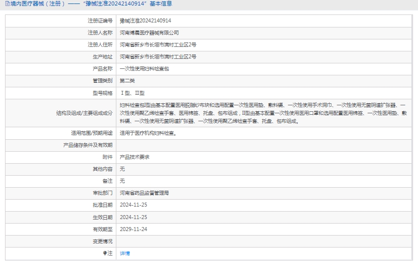 妇科检查包I型由基本配置医用脱脂纱布块和选用配置一次性医用垫、、一次性使用、一次性使用无菌扩张器、一次性使用聚检查手套、医用棉签、托盘、包布组成,II型由基本配置一次性使用医用口罩和选用配置医用棉签、一次性医用垫、、一次性使用无菌扩张器、一次性使用聚检查手套、托盘、包布组成。