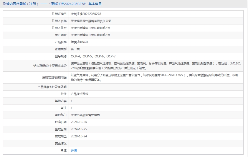 该产品由主机(包括空气压缩机、空气预处理系统、控制阀、分子筛吸附塔、产出气处理系统、控制及报警系统),电池组,EM11012M电源适配器和鼻氧管(外购件已取得二类注册证)组成。