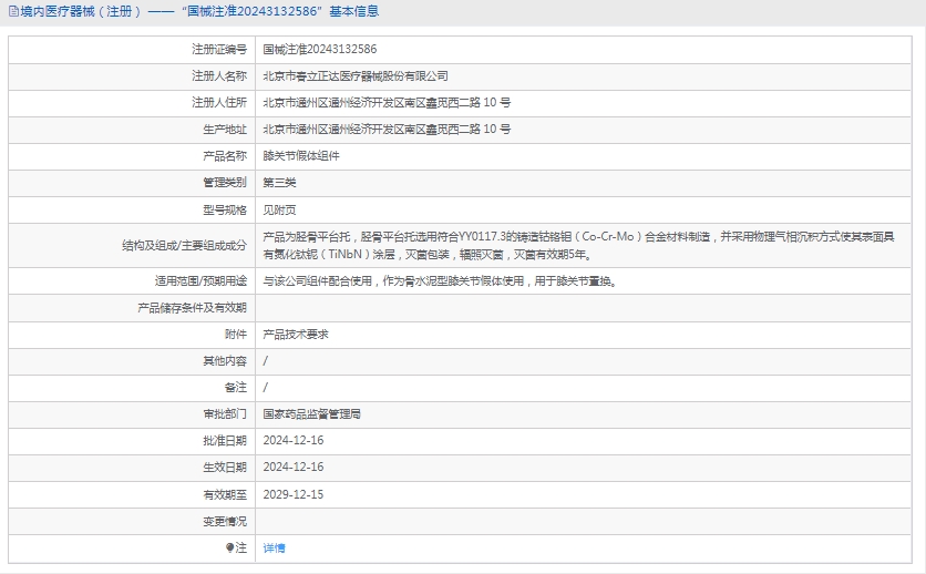 产品为胫骨平台托,胫骨平台托选用符合YY0117.3的铸造钴铬钼(Co-Cr-Mo)合金材料制造,并采用物理气相沉积方式使其表面具有氮化钛铌(TiNbN)涂层,灭菌包装,辐照灭菌,灭菌有效期5年。