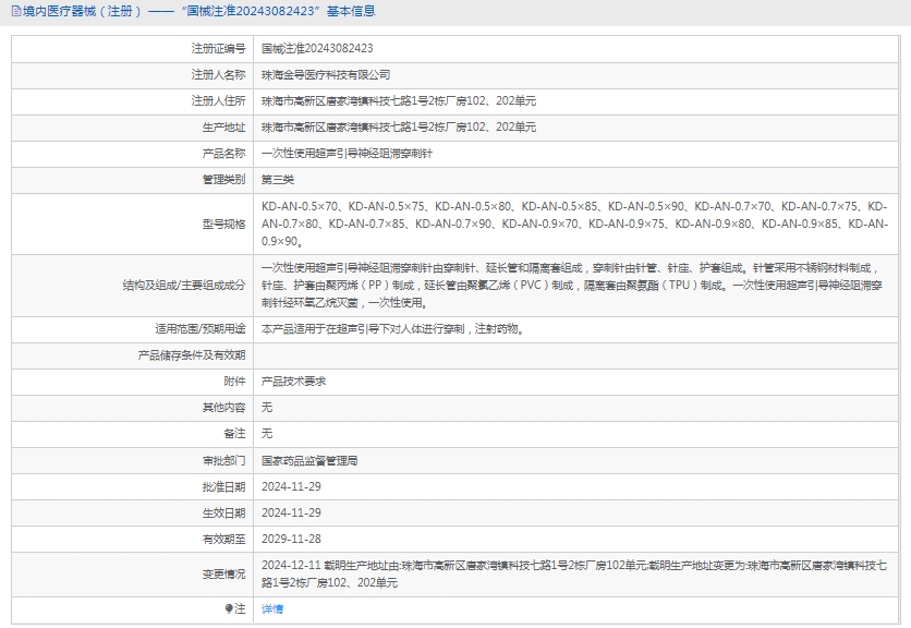 一次性使用超声引导神经阻滞穿刺针由穿刺针、延长管和隔离套组成,穿刺针由针管、针座、护套组成。针管采用不锈钢材料制成,针座、护套由聚(PP)制成,延长管由聚(PVC)制成,隔离套由聚氨酯(TPU)制成。一次性使用超声引导神经阻滞穿刺针经灭菌,一次性使用。
