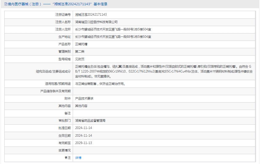正畸托槽由主体(包含槽沟、结扎翼)及基底组成,活动盖片和弹性件(仅限自锁式的正畸托槽),牵引钩(仅限带钩的正畸托槽)。由符合 GB/T 1220-2007中规定的06Cr19Ni10、022Cr17Ni12Mo2(基底)和05Cr17Ni4Cu4Nb(主体、活动盖片不锈钢材料制成,弹性件镍钛合金材料制成)。非无菌提供。