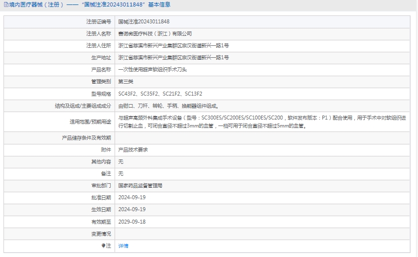与超声高频外科集成手术设备(型号:SC300ES/SC200ES/SC100ES/SC200,软件发布版本:P1)配合使用,用于手术中对软组织进行切割止血,可闭合直径不超过3mm的血管,一档可用于闭合直径不超过5mm的血管。